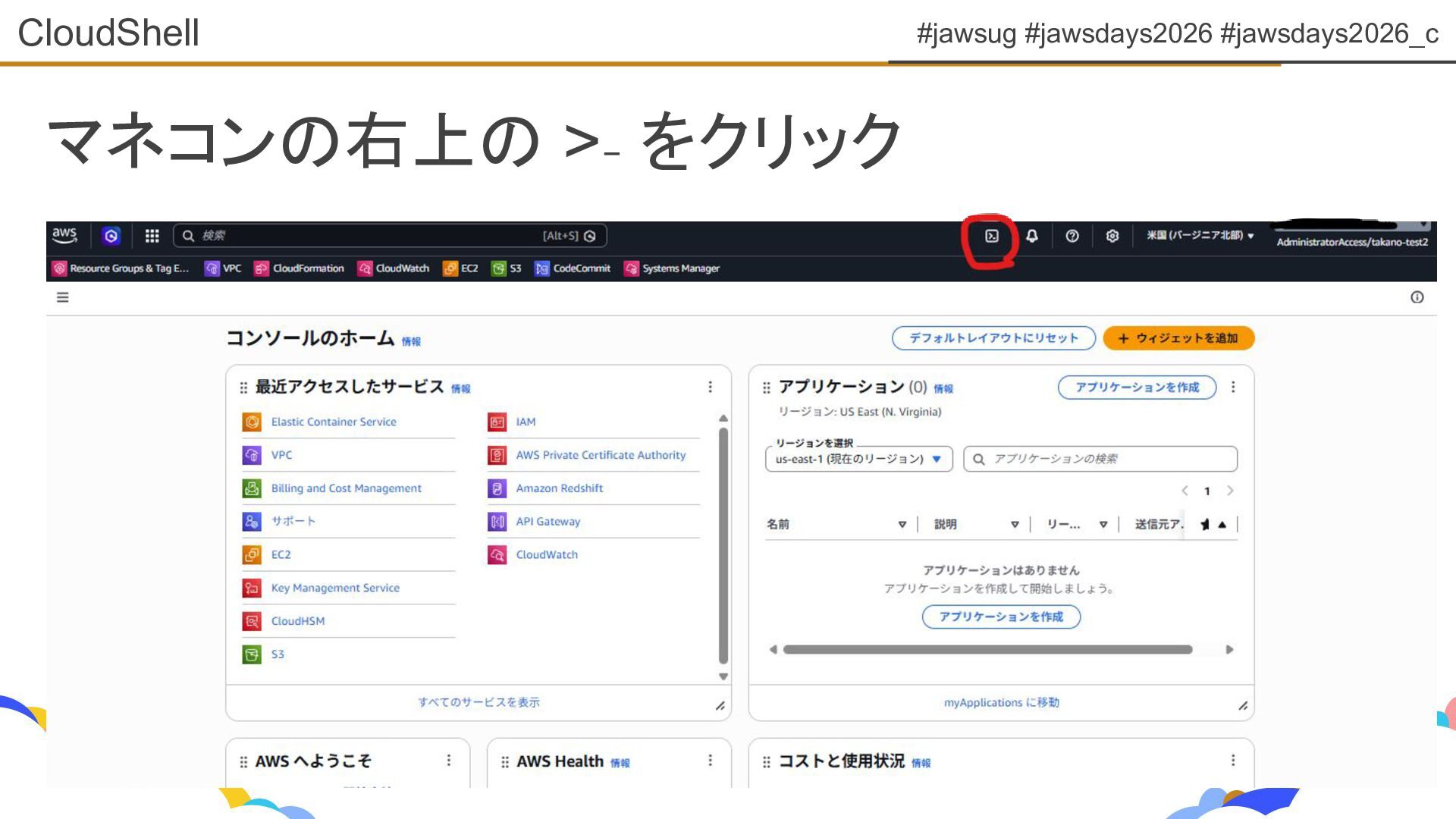 #jawsug #jawsdays2026 #jawsdays2026_c マネコンの右上の >₋ をクリック CloudShell