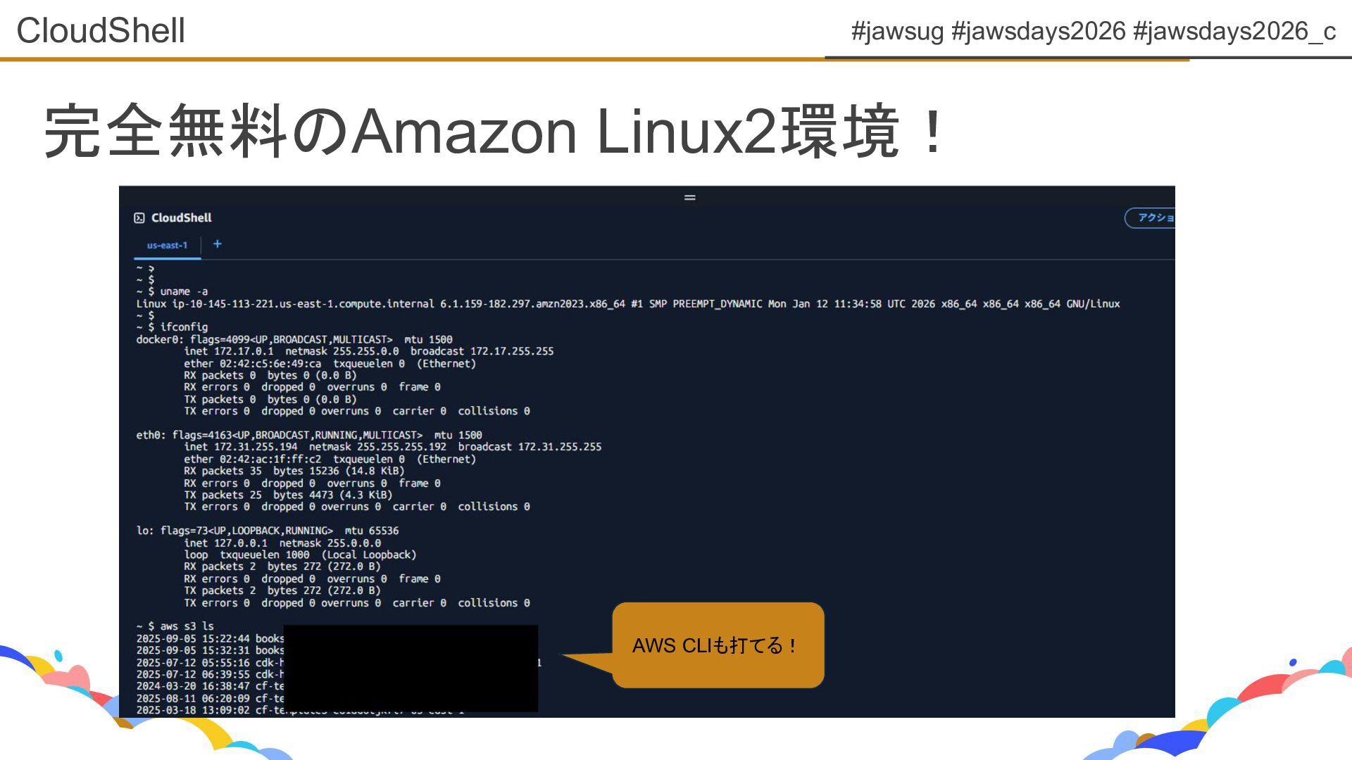 #jawsug #jawsdays2026 #jawsdays2026_c 完全無料のAmazon Linux2環境! CloudShell AWS CLIも打てる!