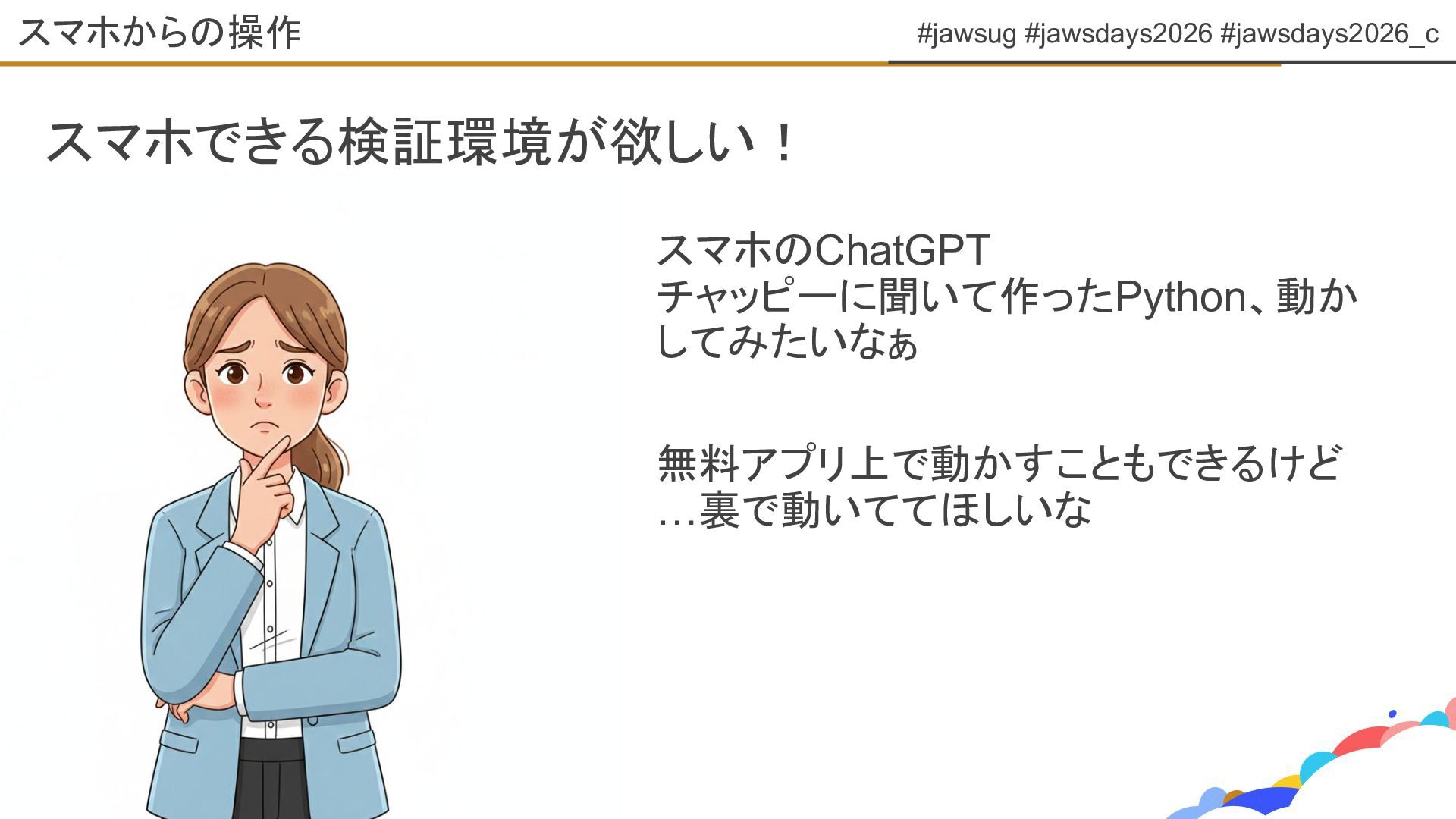 #jawsug #jawsdays2026 #jawsdays2026_c スマホできる検証環境が欲しい! スマホからの操作 スマホのChatGPT チャッピーに聞いて作ったPython、動か してみたいなぁ 無料アプリ上で動かすこともできるけど …裏で動いててほしいな