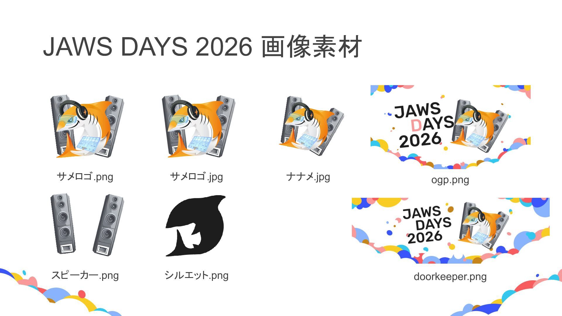 JAWS DAYS 2026 画像素材 サメロゴ.png サメロゴ.jpg ナナメ.jpg ogp.png スピーカー.png シルエット.png