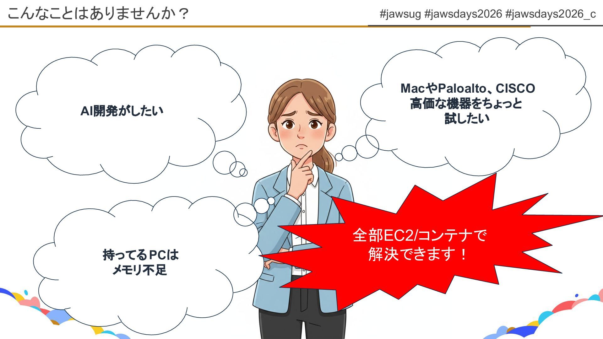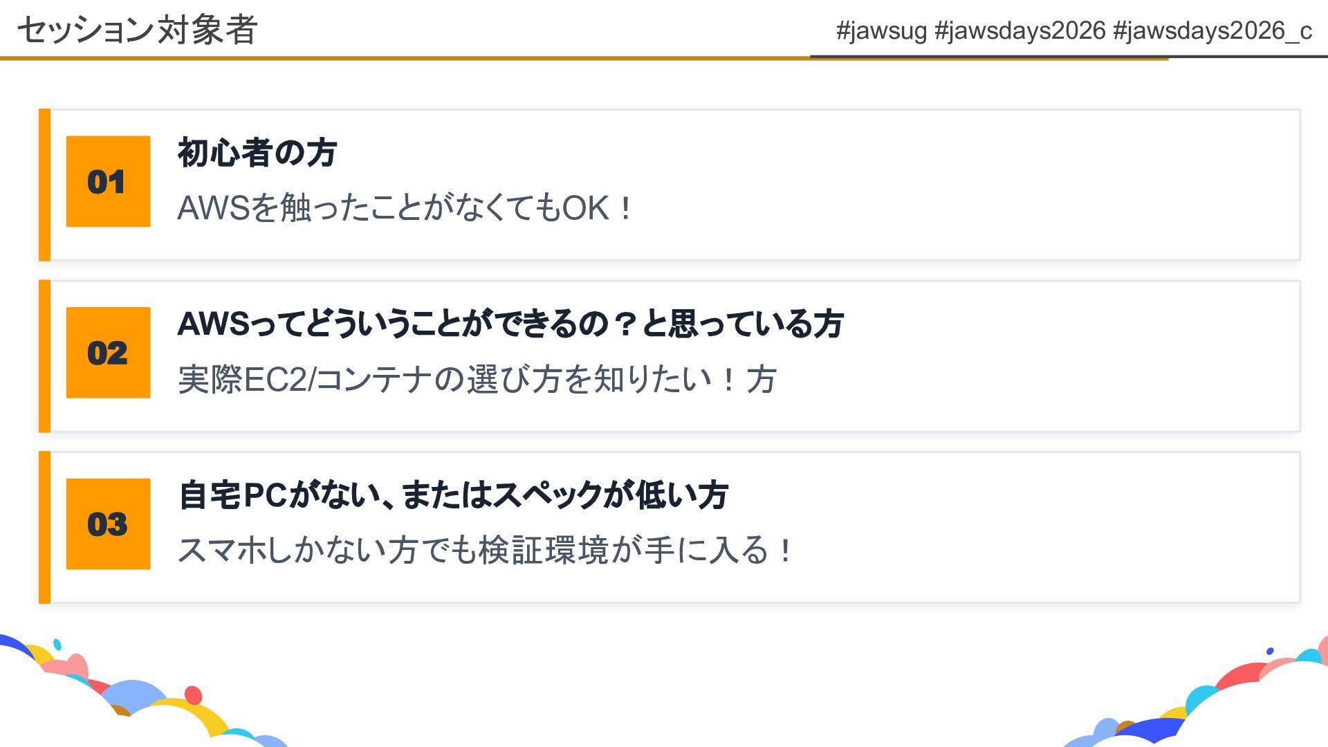 #jawsug #jawsdays2026 #jawsdays2026_c セッション対象者 01 初心者の方 AWSを触ったことがなくてもOK! 02 AWSってどういうことができるの?と思っている方 実際EC2/コンテナの選び方を知りたい!方