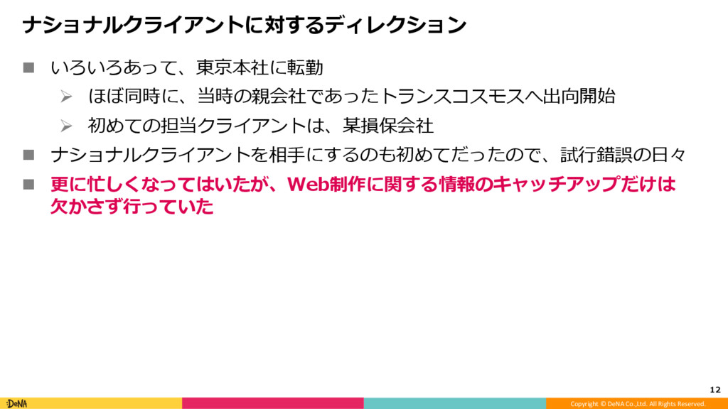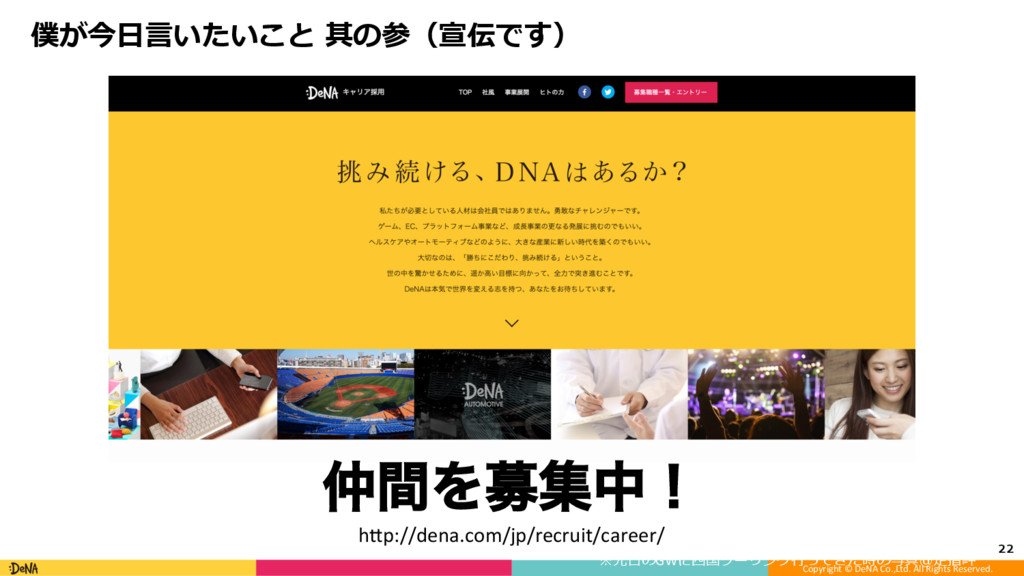 n 健康保険組合向けサービス「KenCoM(ケンコム)」 n ドコモ・ヘルスケア社との協業案件「歩いておトク」 n 現在は、主に、アプリのUXデザイナーとして⽇々業務に邁進してます n ゲームとはまた違って(特にターゲット)難しいところも多々 n 今後の⽬標・課題感 n UXデザイナーとしての経験や実績を詰む n 企画や仕様に落としこむためのスキルをもっと磨く n クライアント(iOS/Android)開発スキルを向上させる 21