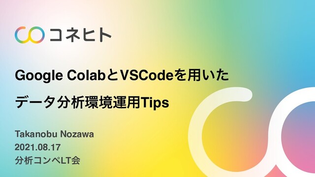 GoogleColabとVSCodeを用いたデータ分析環境運用Tipsについてお話ししました。 後半では、kaggleのコンペティションに参加する際のTipsなども記載しています。 補足ブログ:https://www.takapy.work/entry/2021/08/17/185047