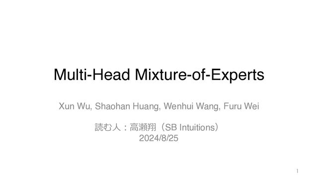evaluation. We report the validation perplexity cross two setting: 8 experts and 32 experts. Model Perplexity # 8 Experts 32 Experts English-focused language modeling Dense (without Experts) 16.23 16.23 X-MoE 14.82 11.96 MH-MoE (Ours) 12.72 10.28 Multi-lingual language modeling Dense (without Experts) 8.56 8.56 X-MoE 7.19 6.02 MH-MoE (Ours) 6.26 5.09 Masked multi-modal modeling Dense (without Experts) 17.95 17.95 X-MoE 16.34 12.68 MH-MoE (Ours) 14.73 10.87 efits from enhanced representation learning capabilities as more experts are incorporated. These results collectively demonstrate the superiority of MH-MoE in terms of learn- ing efficiency and language representation across multiple pre-training paradigms. 4.3. Downstream Evaluation For each pre-training task, we conduct corresponding downstream evaluation to validate the efficacy of MH- MoE. Multi-Head Mixture-of-Experts Table 2. Accuracy / accuracy-normalization scores for language understanding tasks using the LLM Evaluation Harness (Gao et al., 2023). Model ARC-Challenge ARC-Easy RTE BookQA Winogrande PiQA BoolQ HellaSwag TruthfulQA (mc1/mc2) Avg Dense 18.1/23.3 44.9/39.7 51.5 17.1/29.0 48.2 66.6 55.0 29.7/34.1 24.1/39.3 37.2 Experts Number N = 8 X-MoE 19.0/24.7 48.3/42.0 52.7 17.4/29.8 50.3 67.9 58.4 31.4/35.7 24.3/40.2 38.7 MH-MoE 19.6/25.2 50.2/42.2 53.0 18.2/30.3 51.1 68.7 59.6 33.2/40.3 24.7/40.9 39.8 Experts Number N = 32 X-MoE 19.4/24.8 50.4/42.5 52.7 17.8/30.0 51.3 68.8 52.8 33.4/40.1 24.3/39.1 39.1 MH-MoE 21.4/26.8 50.6/44.8 53.4 18.8/31.6 53.8 69.3 56.6 35.0/42.1 24.8/39.5 40.6 Table 3. Accuracy / accuracy-normalization scores on multilingual understand- Dense,通常のMoE(X-MoE)と⽐較 3種のデータセットで学習,PPLが改善 → Downstreamタスクでも性能向上 ↓