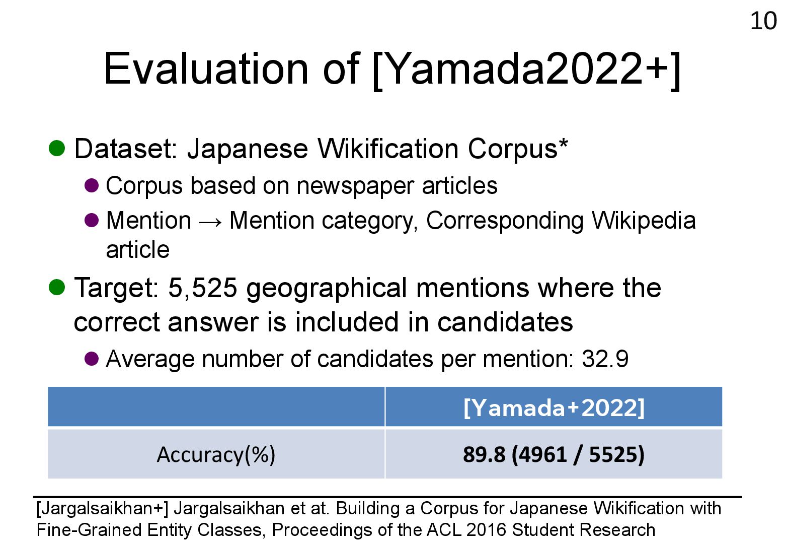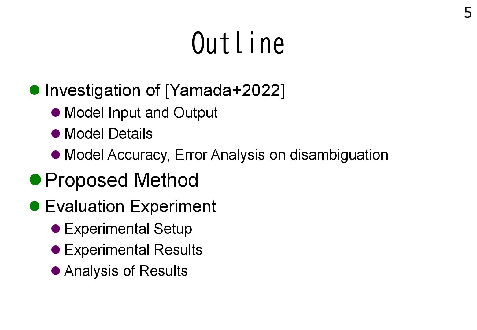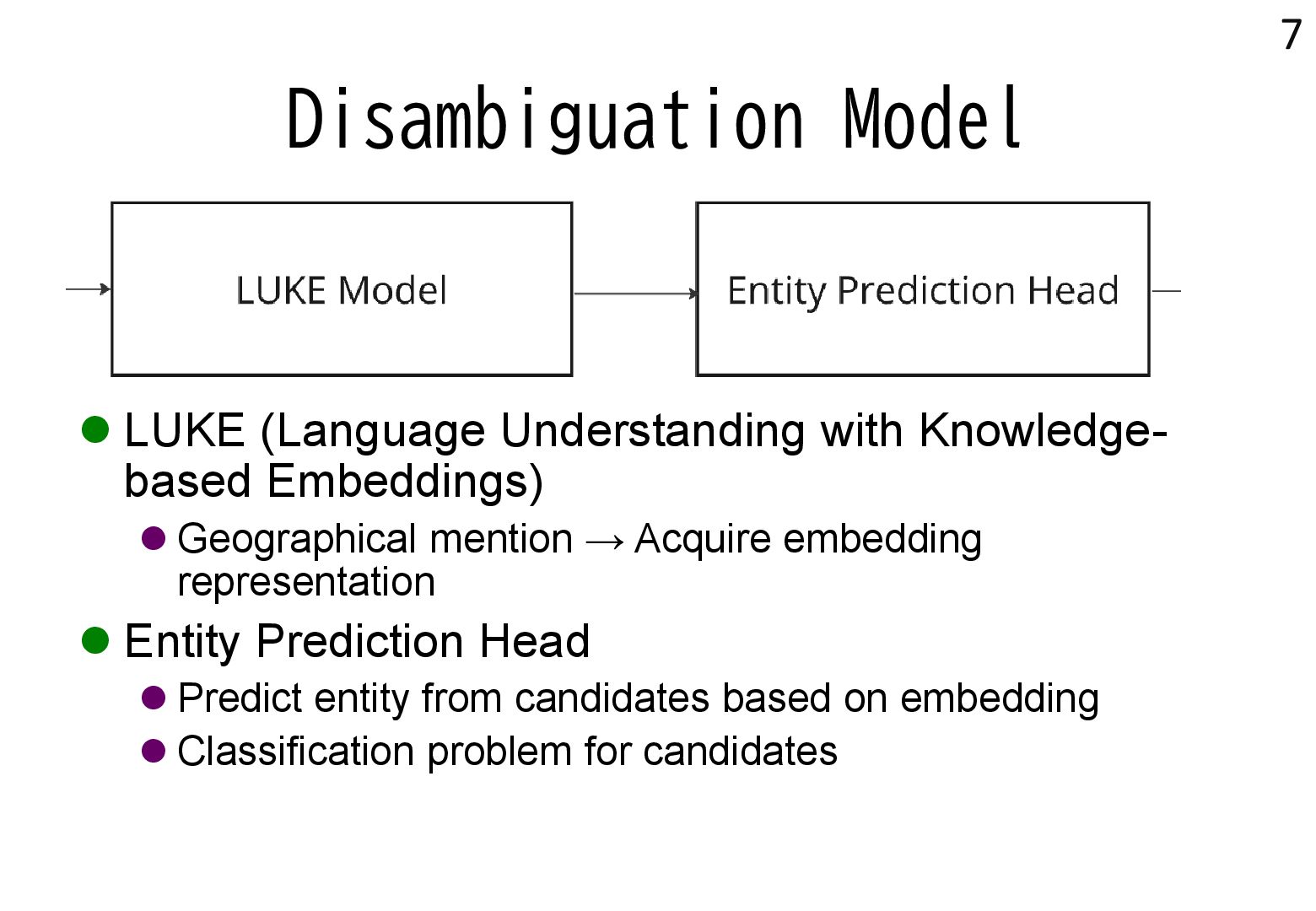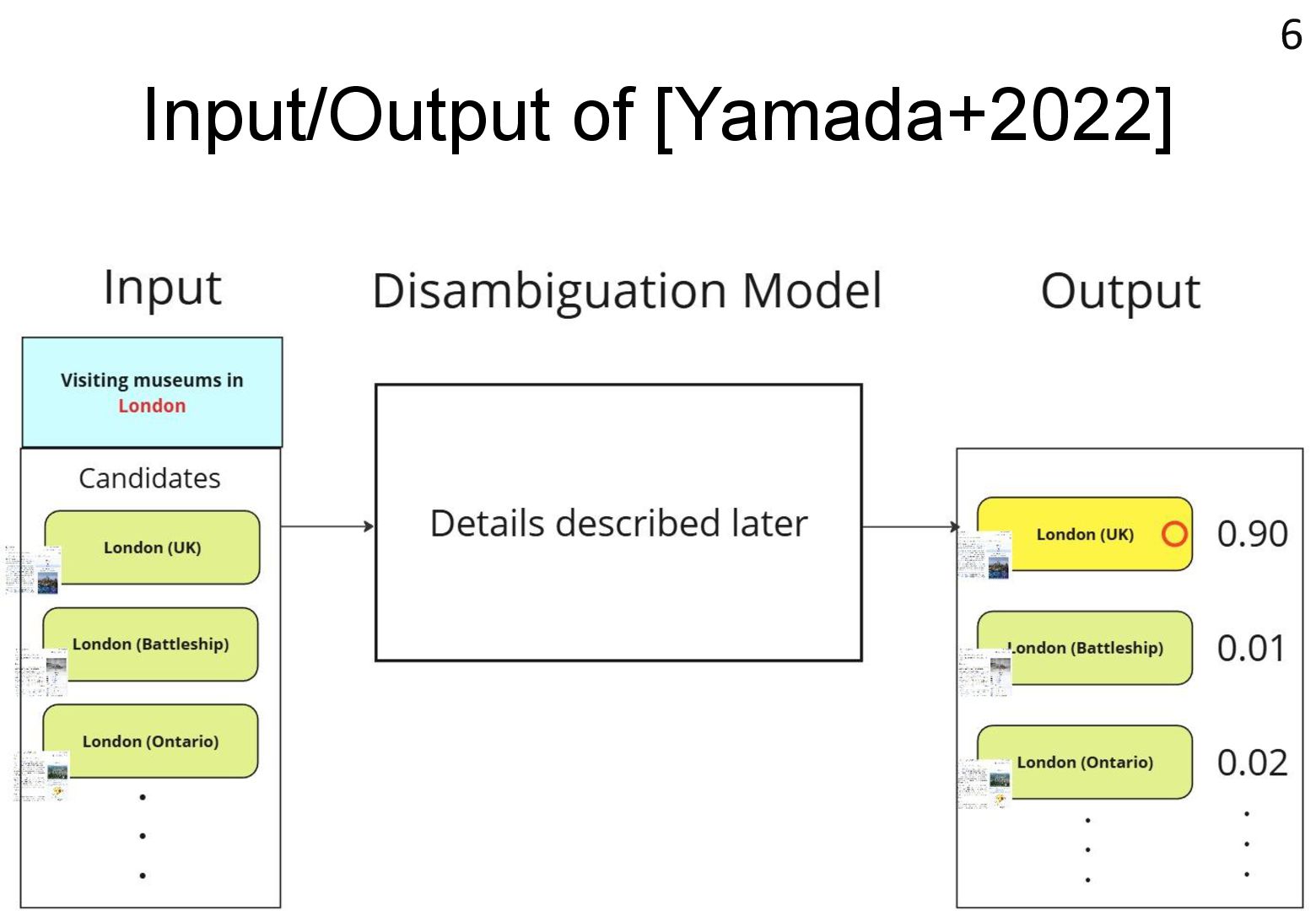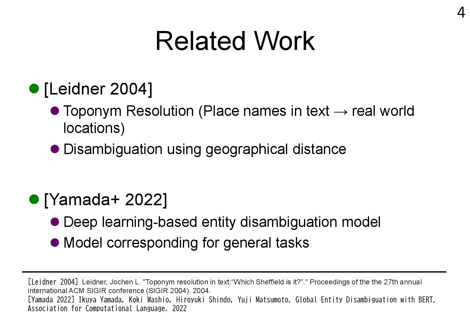 in text → real world locations) ⚫ Disambiguation using geographical distance ⚫ [Yamada+ 2022] ⚫ Deep learning-based entity disambiguation model ⚫ Model corresponding for general tasks 4 [Leidner 2004] Leidner, Jochen L. "Toponym resolution in text:“Which Sheffield is it?”." Proceedings of the the 27th annual international ACM SIGIR conference (SIGIR 2004). 2004. [Yamada 2022] Ikuya Yamada, Koki Washio, Hiroyuki Shindo, Yuji Matsumoto. Global Entity Disambiguation with BERT. Association for Computational Language. 2022