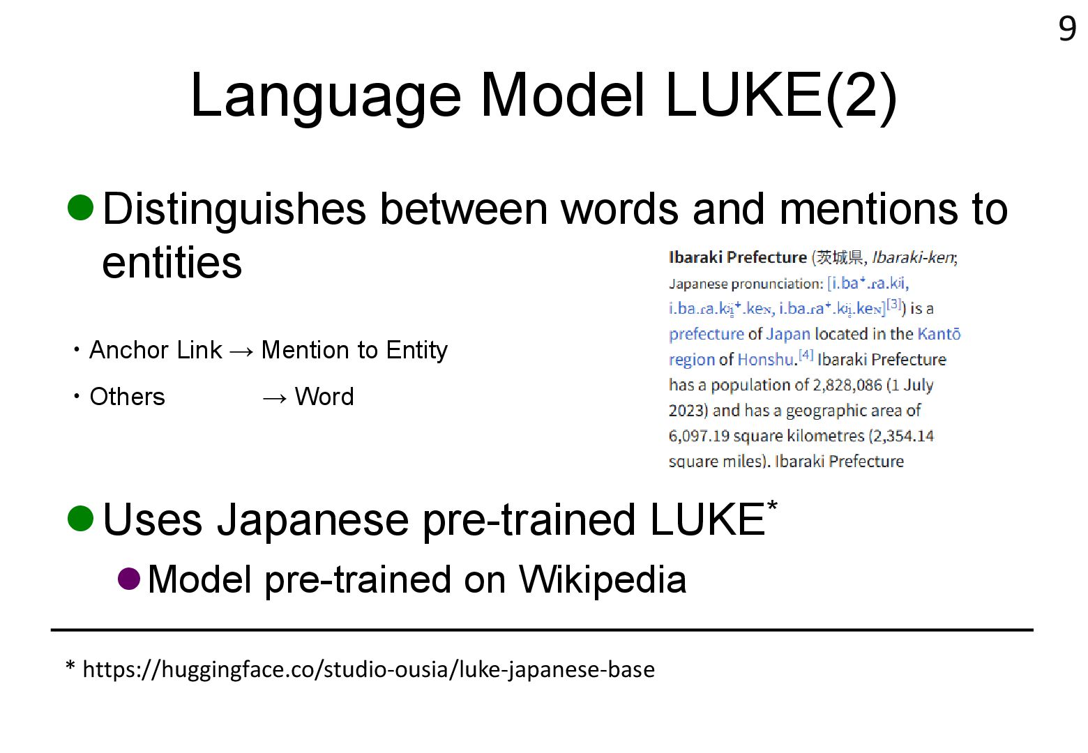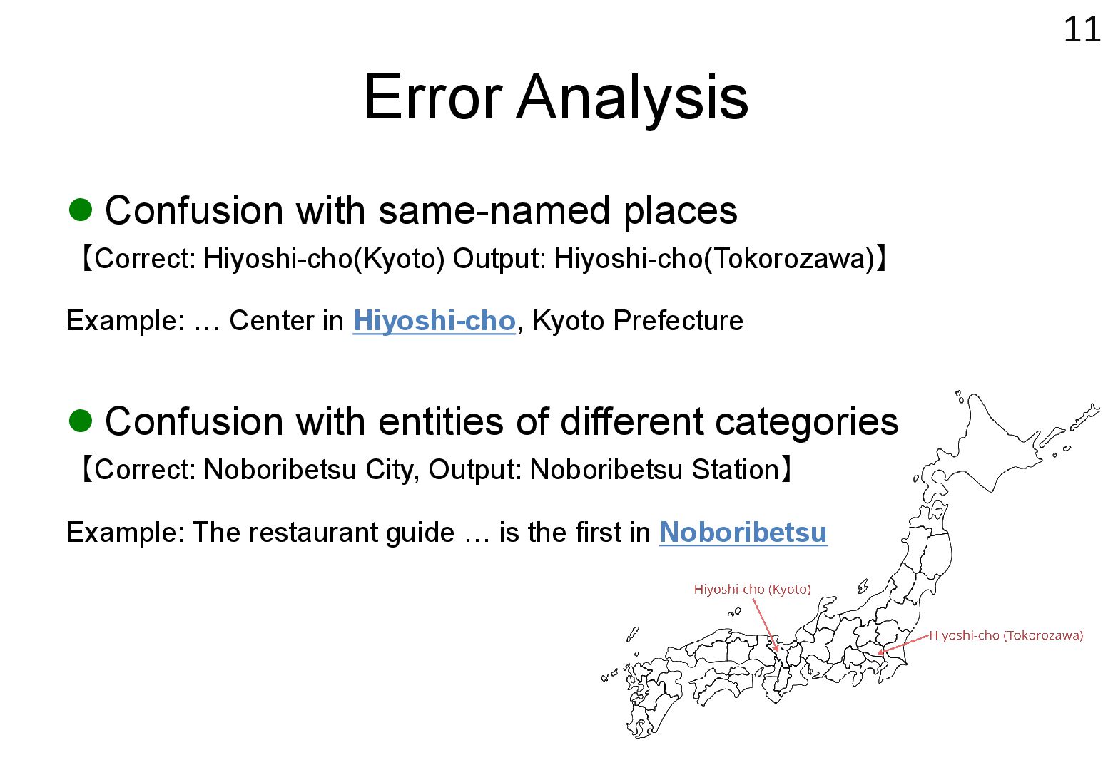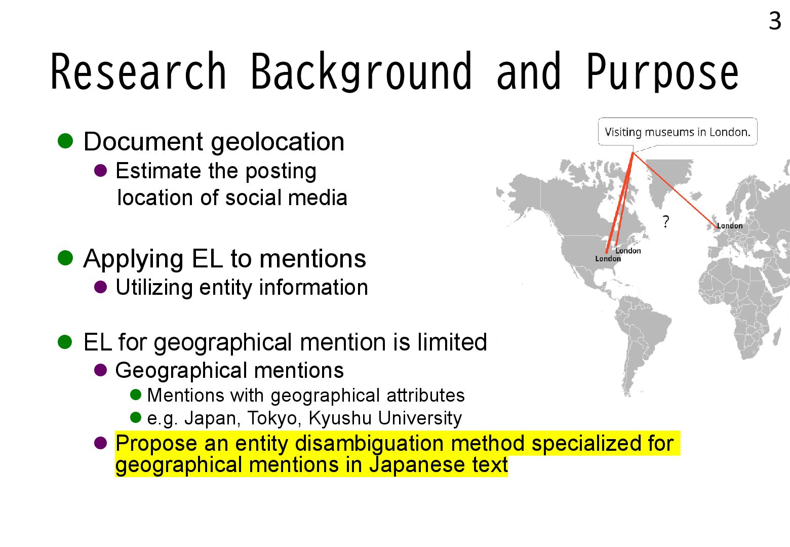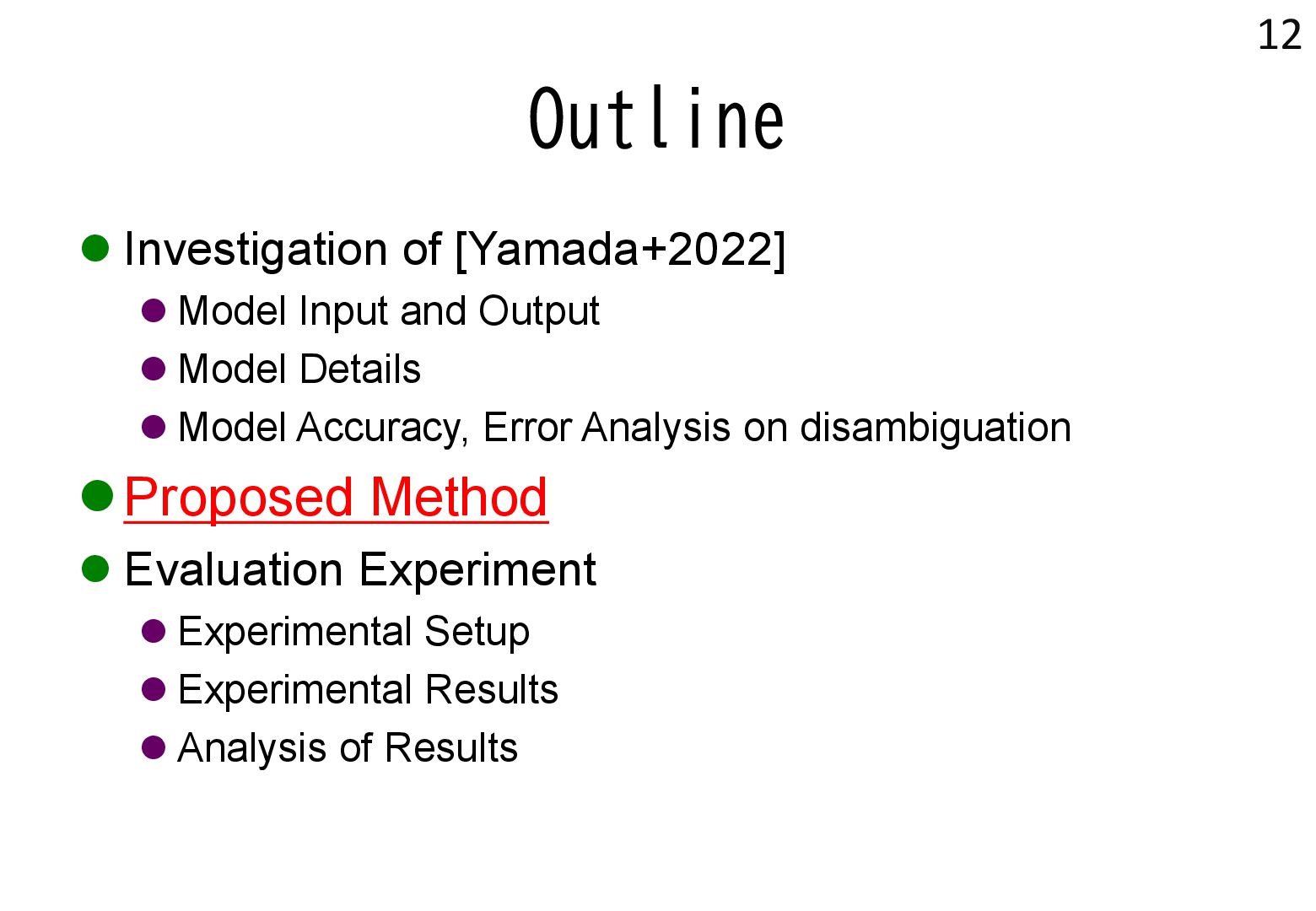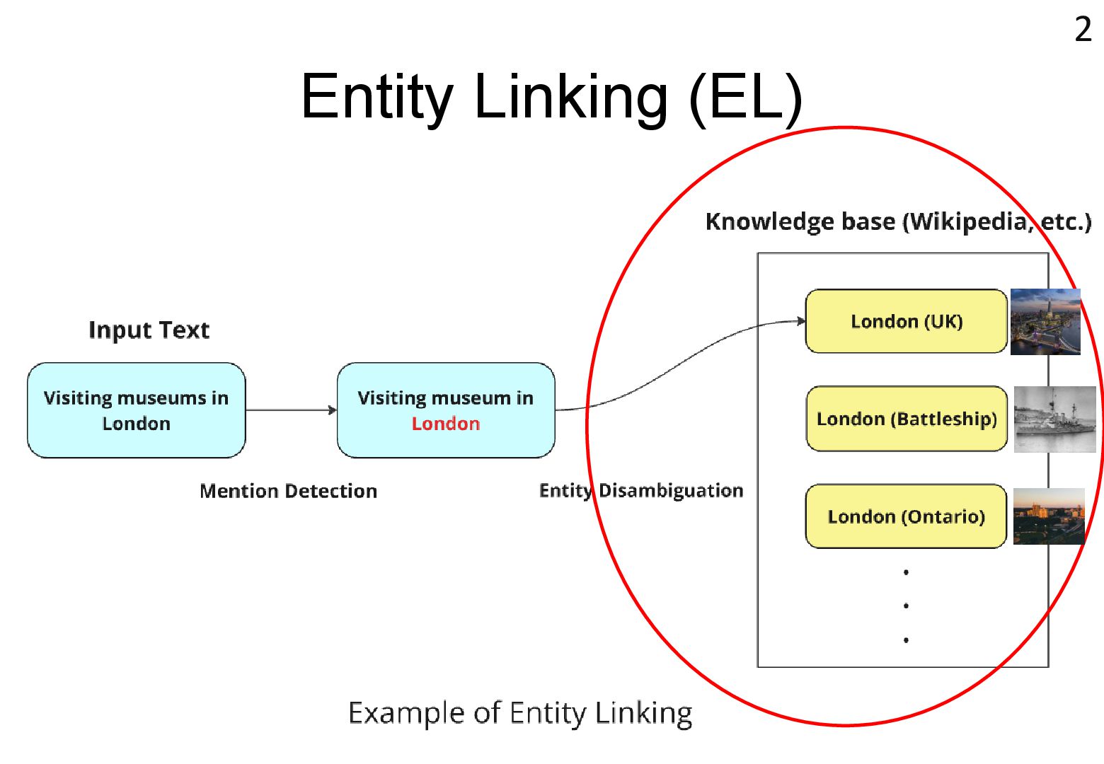in text → real world locations) ⚫ Disambiguation using geographical distance ⚫ [Yamada+ 2022] ⚫ Deep learning-based entity disambiguation model ⚫ Model corresponding for general tasks 4 [Leidner 2004] Leidner, Jochen L. "Toponym resolution in text:“Which Sheffield is it?”." Proceedings of the the 27th annual international ACM SIGIR conference (SIGIR 2004). 2004. [Yamada 2022] Ikuya Yamada, Koki Washio, Hiroyuki Shindo, Yuji Matsumoto. Global Entity Disambiguation with BERT. Association for Computational Language. 2022