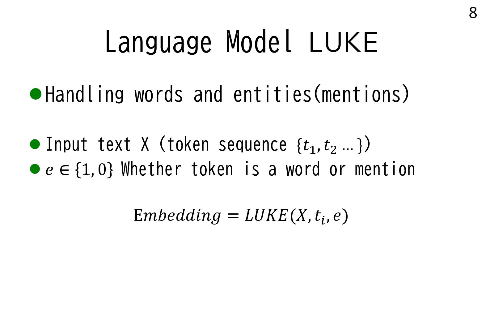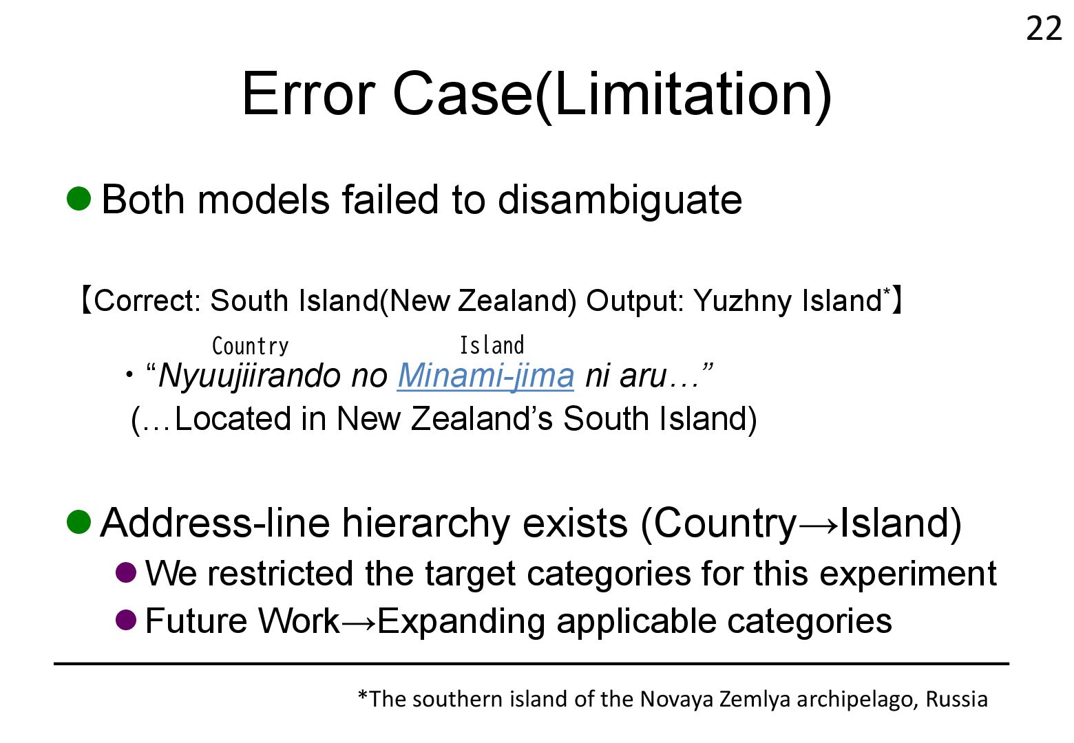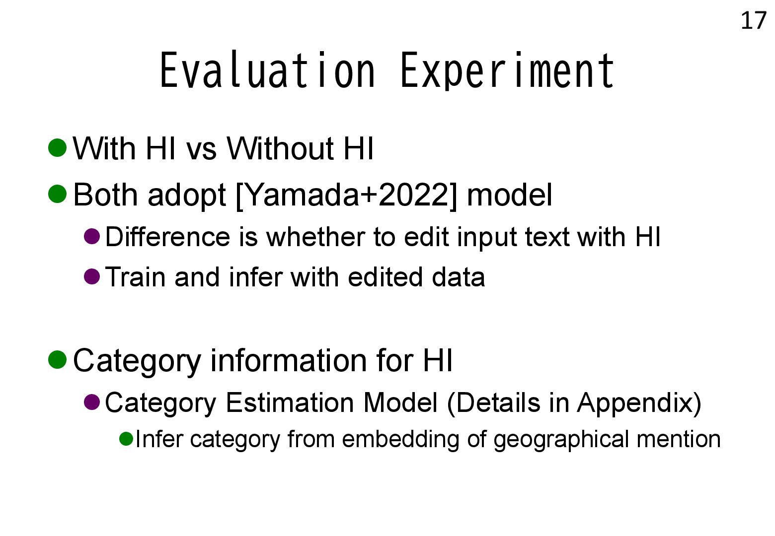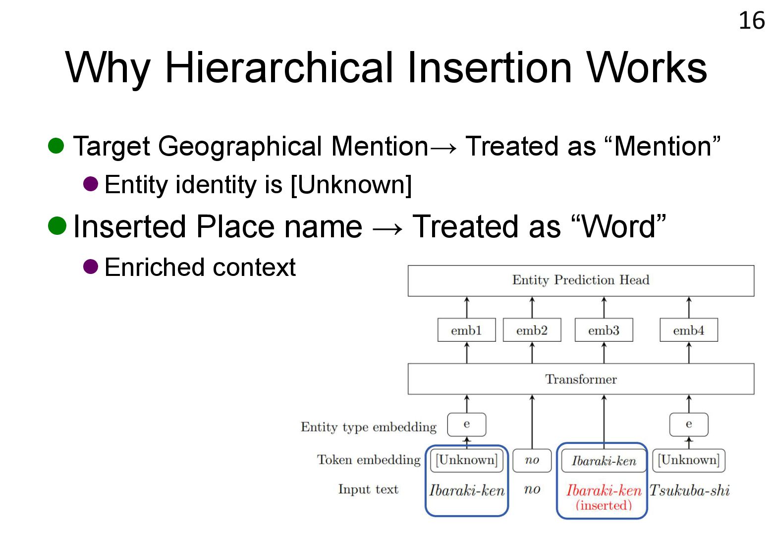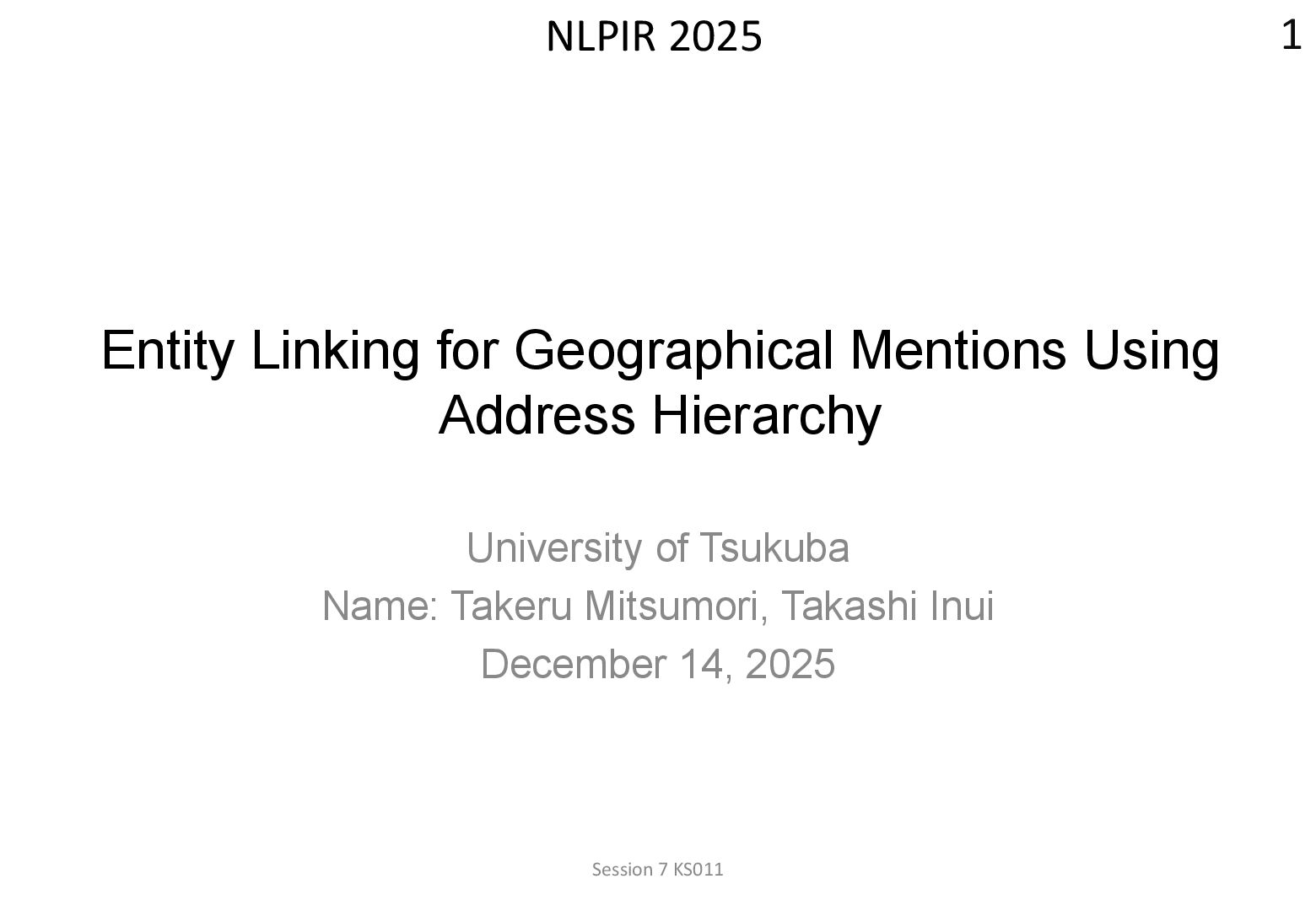 in text → real world locations) ⚫ Disambiguation using geographical distance ⚫ [Yamada+ 2022] ⚫ Deep learning-based entity disambiguation model ⚫ Model corresponding for general tasks 4 [Leidner 2004] Leidner, Jochen L. "Toponym resolution in text:“Which Sheffield is it?”." Proceedings of the the 27th annual international ACM SIGIR conference (SIGIR 2004). 2004. [Yamada 2022] Ikuya Yamada, Koki Washio, Hiroyuki Shindo, Yuji Matsumoto. Global Entity Disambiguation with BERT. Association for Computational Language. 2022