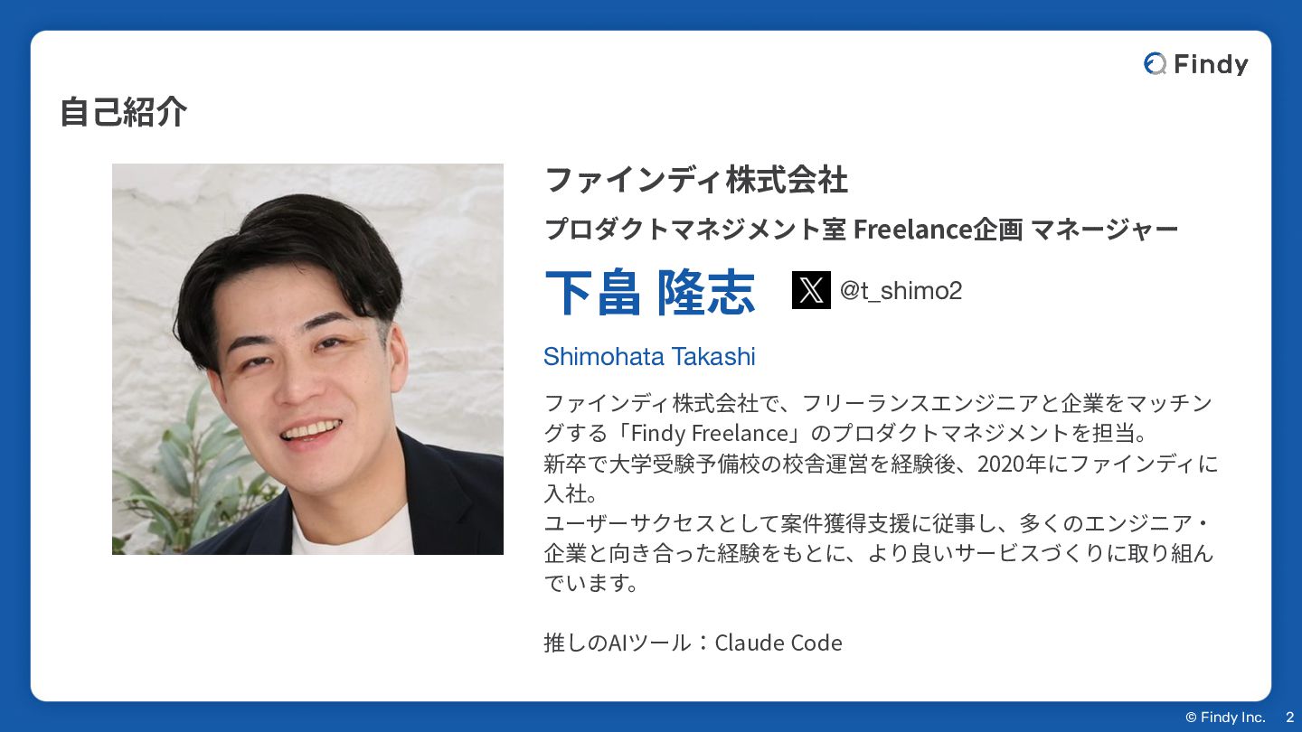 企業と向き合った経験をもとに、より良いサービスづくりに取り組ん でいます。 推しのAIツール:Claude Code 下畠 隆志 プロダクトマネジメント室 Freelance企画 マネージャー @t_shimo2 ファインディ株式会社 Shimohata Takashi 2