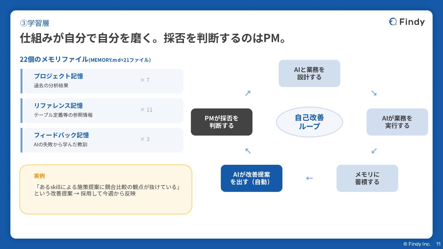 を出す(⾃動) PMが採否を 判断する ↘ ↙ ← ↖ ↗ ⾃⼰改善 ループ 22個のメモリファイル(MEMORY.md+21ファイル) プロジェクト記憶 過去の分析結果 × 7 リファレンス記憶 テーブル定義等の参照情報 × 11 フィードバック記憶 AIの失敗から学んだ教訓 × 3 実例 「あるskillによる施策提案に競合⽐較の観点が抜けている」 という改善提案 → 採⽤して今週から反映 ③学習層 仕組みが⾃分で⾃分を磨く。採否を判断するのはPM。 11