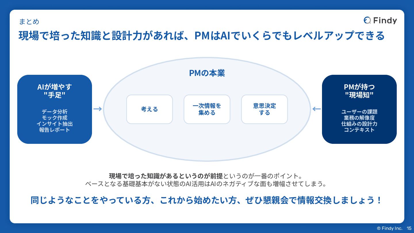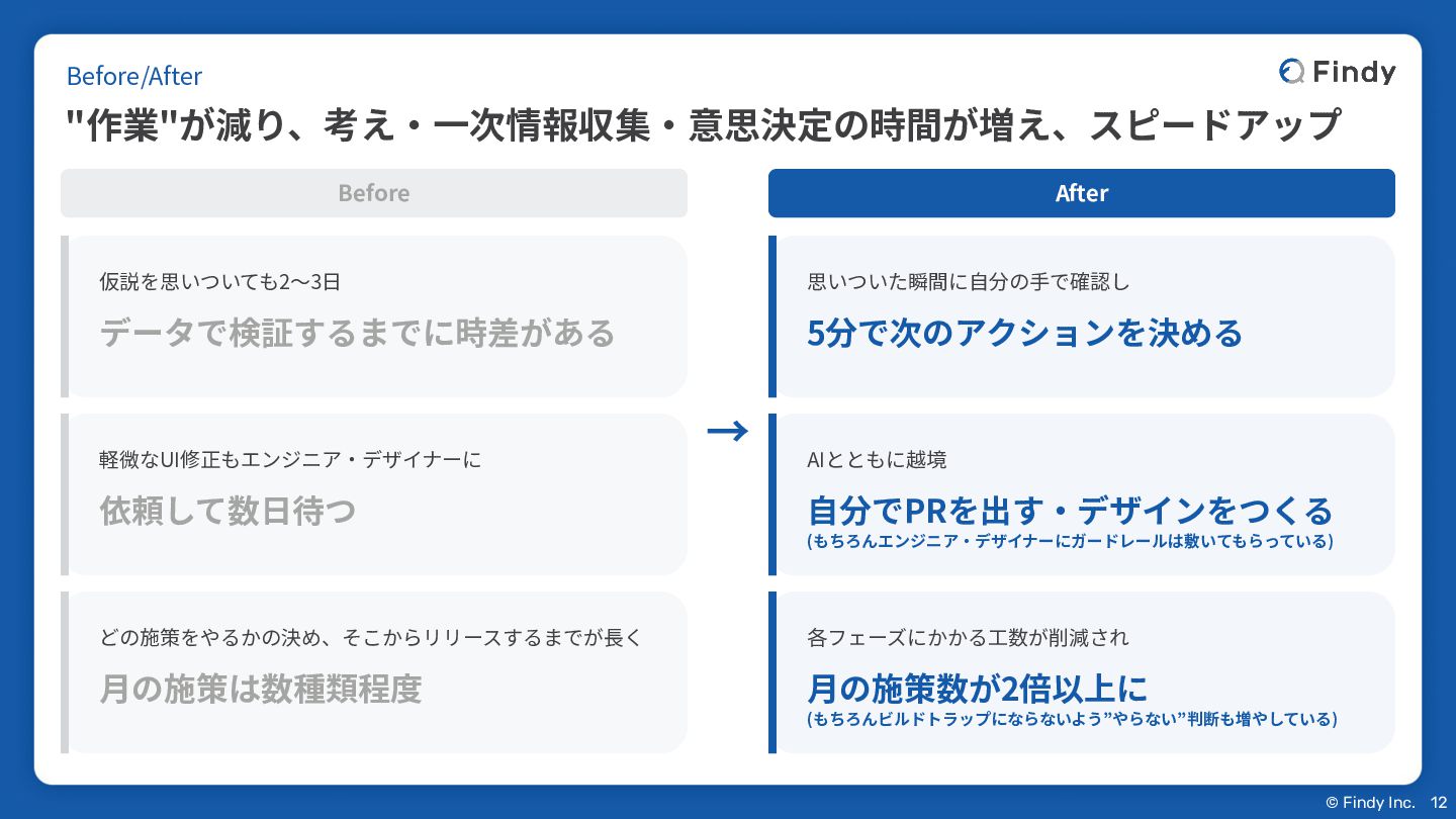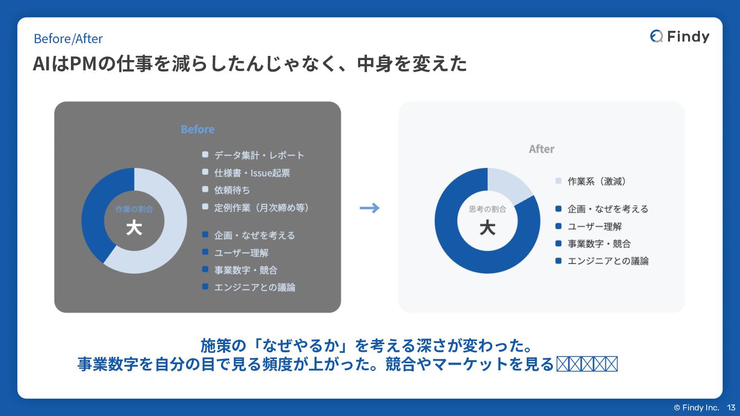 © Findy Inc. Before/After AIはPMの仕事を減らしたんじゃなく、中⾝を変えた 13 施策の「なぜやるか」を考える深さが変わった。 事業数字を⾃分の⽬で⾒る頻度が上がった。競合やマーケットを⾒る余裕ができた。