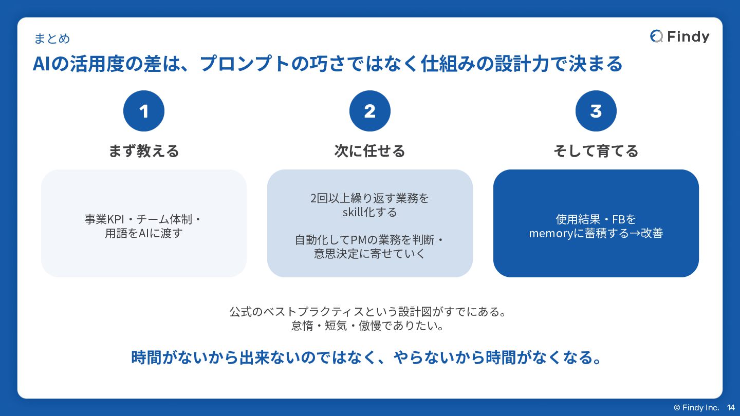 © Findy Inc. AIの活⽤度の差は、プロンプトの巧さではなく仕組みの設計⼒で決まる 1 まず教える 事業KPI‧チーム体制‧ ⽤語をAIに渡す 2 次に任せる