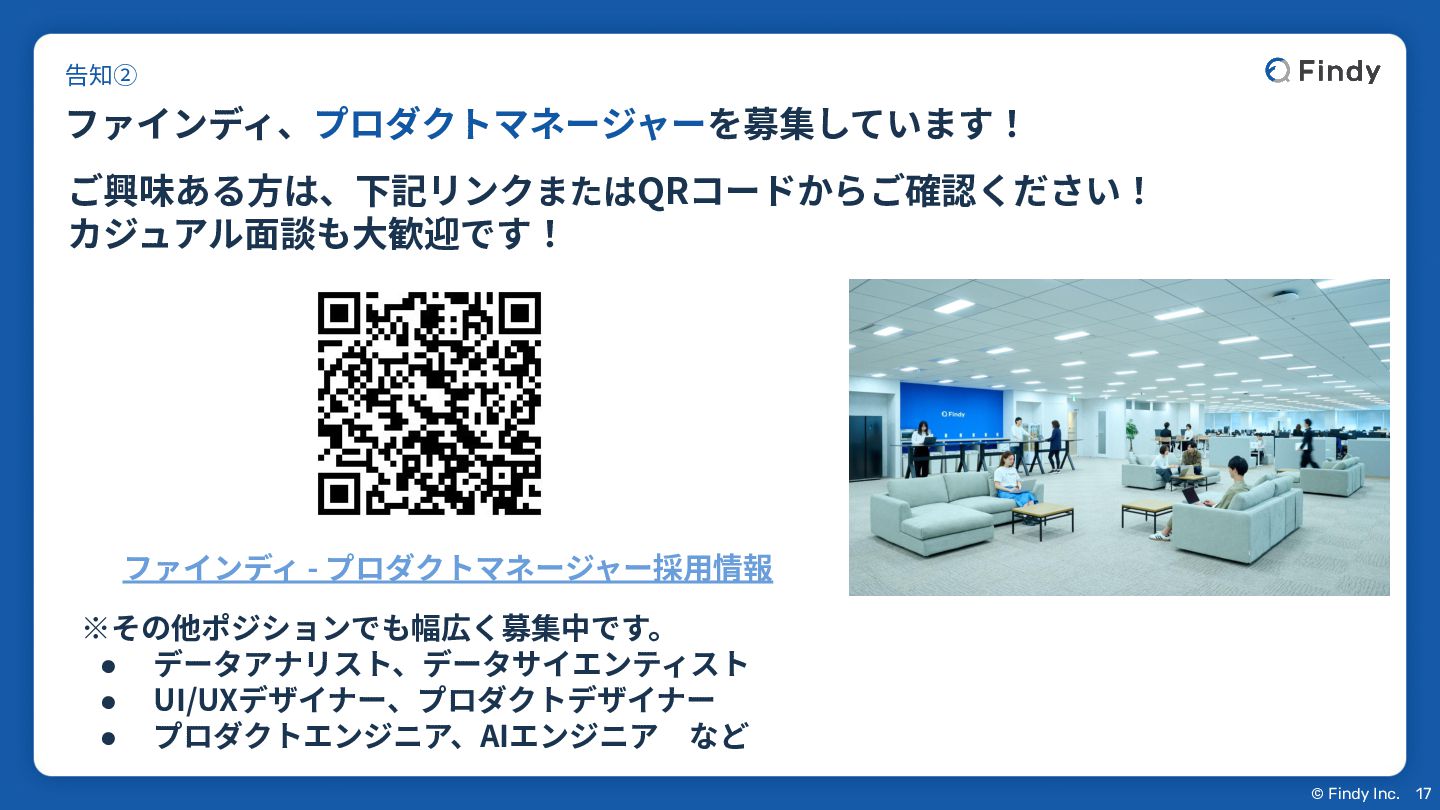 © Findy Inc. 17 ファインディ、プロダクトマネージャーを募集しています! 告知② ご興味ある⽅は、下記リンクまたはQRコードからご確認ください! カジュアル⾯談も⼤歓迎です! ファインディ -