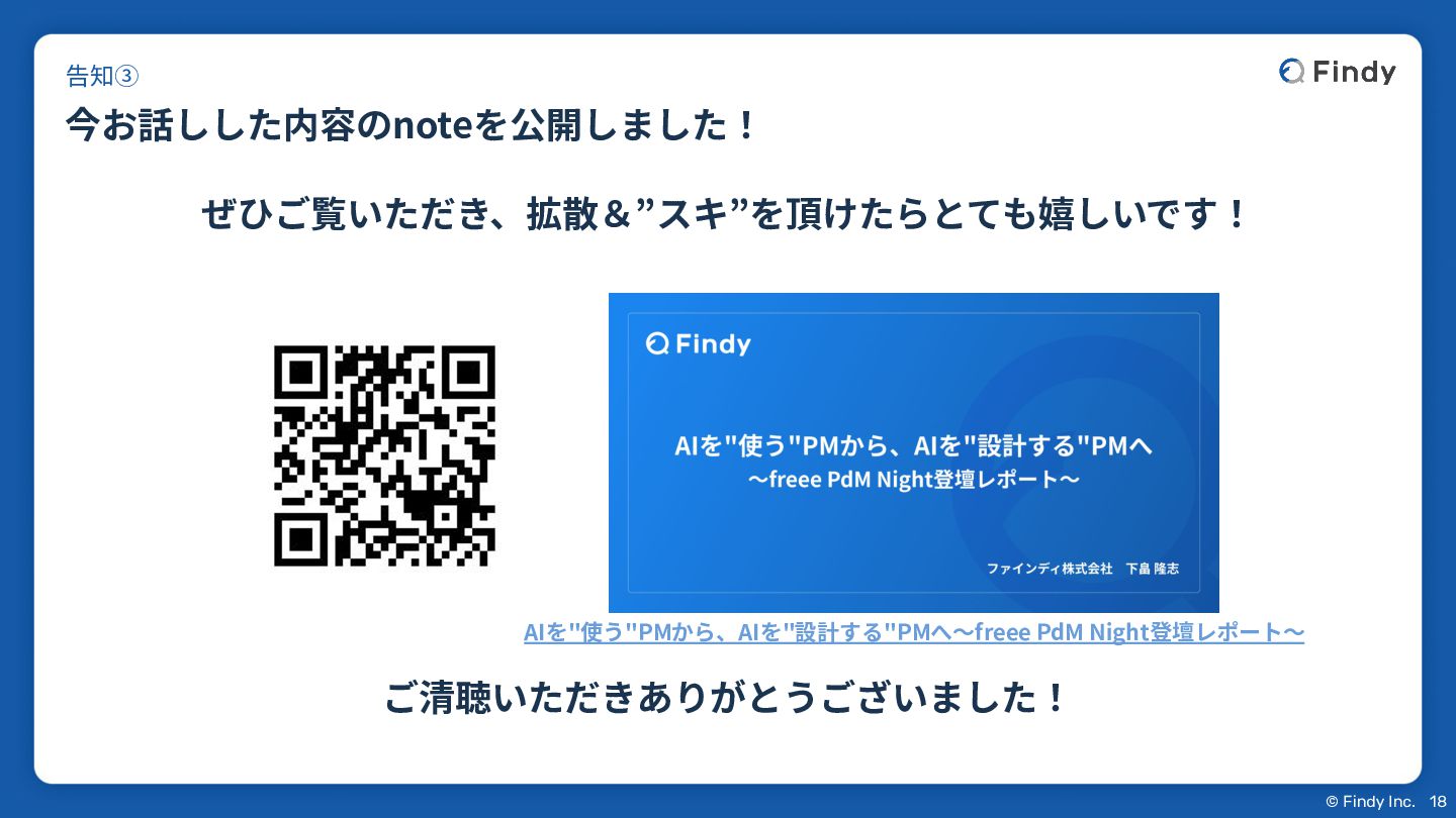 © Findy Inc. 18 今お話しした内容のnoteを公開しました! 告知③ ぜひご覧いただき、拡散&”スキ”を頂けたらとても嬉しいです! ご清聴いただきありがとうございました! AIを"使う"PMから、AIを"設計する"PMへ〜freee PdM