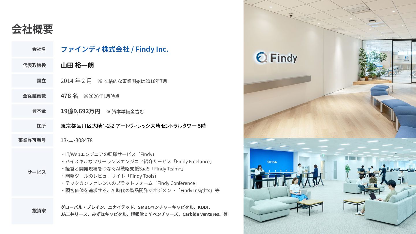 2014 年 2 ⽉ ※ 本格的な事業開始は2016年7⽉ 全従業員数 478 名 ※2026年1⽉時点 資本⾦ 19億9,692万円 ※ 資本準備⾦含む 住所 東京都品川区大崎1-2-2 アートヴィレッジ大崎セントラルタワー 5階 事業許可番号 13-ユ-308478 サービス ‧IT/Webエンジニアの転職サービス「Findy」 ‧ハイスキルなフリーランスエンジニア紹介サービス「Findy Freelance」 ‧経営と開発現場をつなぐAI戦略⽀援SaaS「Findy Team+」 ‧開発ツールのレビューサイト「Findy Tools」 ‧テックカンファレンスのプラットフォーム「Findy Conference」 ‧顧客価値を追求する、AI時代の製品開発マネジメント「Findy Insights」等 投資家 グローバル‧ブレイン、ユナイテッド、SMBCベンチャーキャピタル、KDDI、 JA三井リース、みずほキャピタル、博報堂DYベンチャーズ、Carbide Ventures、等