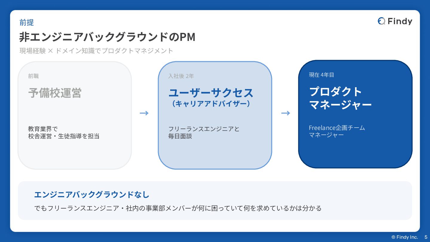 → ⼊社後 2年 ユーザーサクセス (キャリアアドバイザー) フリーランスエンジニアと 毎⽇⾯談 → 現在 4年⽬ プロダクト マネージャー Freelance企画チーム マネージャー エンジニアバックグラウンドなし でもフリーランスエンジニア‧社内の事業部メンバーが何に困っていて何を求めているかは分かる 前提 ⾮エンジニアバックグラウンドのPM 5