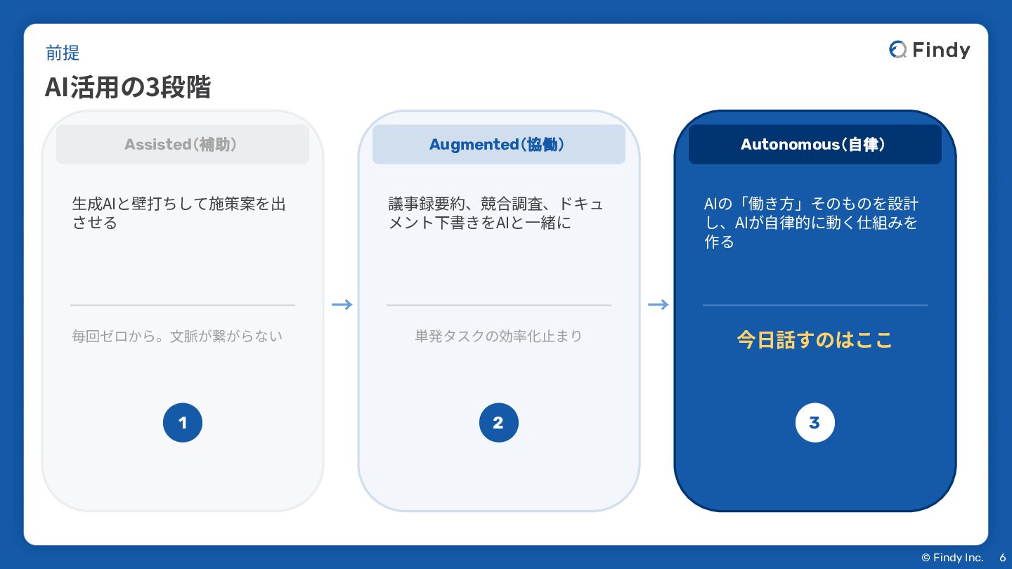 議事録要約、競合調査、ドキュ メント下書きをAIと⼀緒に 単発タスクの効率化⽌まり 2 → Autonomous(自律) AIの「働き⽅」そのものを設計 し、AIが⾃律的に動く仕組みを 作る 今⽇話すのはここ 3 前提 AI活⽤の3段階 6