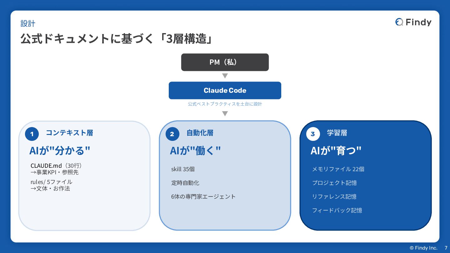 © Findy Inc. PM(私) ▼ Claude Code 公式ベストプラクティスを⼟台に設計 ▼ 1