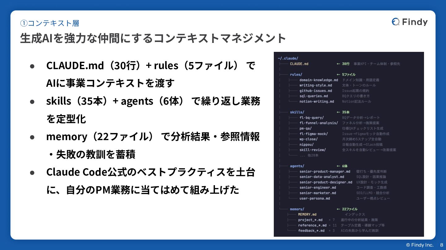 skills(35本)+ agents(6体) で繰り返し業務 を定型化 • memory(22ファイル) で分析結果‧参照情報 ‧失敗の教訓を蓄積 • Claude Code公式のベストプラクティスを⼟台 に、⾃分のPM業務に当てはめて組み上げた ①コンテキスト層 8