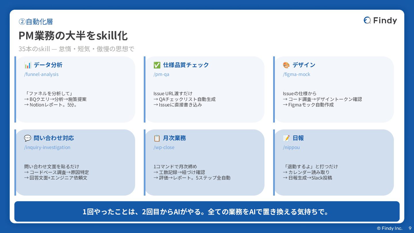Notionレポート。5分。 ✅ 仕様品質チェック /pm-qa Issue URL渡すだけ → QAチェックリスト⾃動⽣成 → Issueに直接書き込み 🎨 デザイン /figma-mock Issueの仕様から → コード調査→デザイントークン確認 → Figmaモック⾃動作成 💬 問い合わせ対応 /inquiry-investigation 問い合わせ⽂⾯を貼るだけ → コードベース調査→原因特定 → 回答⽂⾯+エンジニア依頼⽂ 📋 ⽉次業務 /wp-close 1コマンドで⽉次締め → ⼯数記録→紐づけ確認 → 評価→レポート。5ステップ全⾃動 📝 ⽇報 /nippou 「退勤するよ」と打つだけ → カレンダー読み取り → ⽇報⽣成→Slack投稿 1回やったことは、2回⽬からAIがやる。全ての業務をAIで置き換える気持ちで。 35本のskill — 怠惰‧短気‧傲慢の思想で ②⾃動化層 PM業務の⼤半をskill化 9