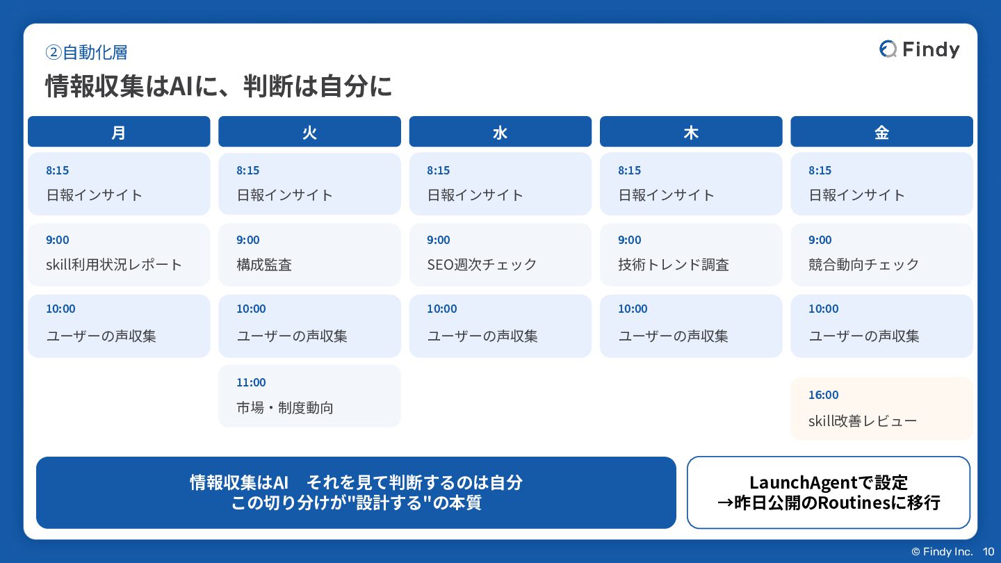 ⽕ 8:15 ⽇報インサイト 9:00 構成監査 11:00 市場‧制度動向 ⽔ 8:15 ⽇報インサイト 9:00 SEO週次チェック ⽊ 8:15 ⽇報インサイト 9:00 技術トレンド調査 ⾦ 8:15 ⽇報インサイト 9:00 競合動向チェック 16:00 skill改善レビュー ②⾃動化層 情報収集はAIに、判断は⾃分に 10:00 ユーザーの声収集 10:00 ユーザーの声収集 10:00 ユーザーの声収集 10:00 ユーザーの声収集 情報収集はAI それを⾒て判断するのは⾃分 この切り分けが"設計する"の本質 10 LaunchAgentで設定 →昨⽇公開のRoutinesに移⾏