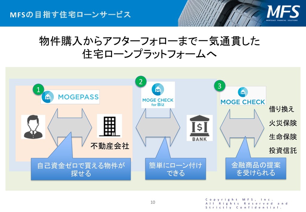 t M F S , I n c . A l l R i g h t s R e s e r v e d a n d S t r i c t l y C o n f i d e n t i a l . MFSの目指す住宅ローンサービス 物件購入からアフターフォローまで一気通貫した 住宅ローンプラットフォームへ 不動産会社 火災保険 生命保険 投資信託 簡単にローン付け できる 自己資金ゼロで買える物件が 探せる 金融商品の提案 を受けられる 借り換え 1 2 3