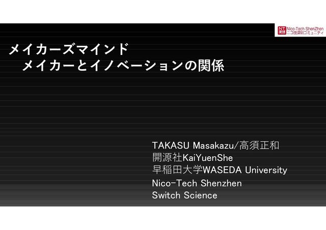 メイカーズマインド メイカーとイノベーションの関係 TAKASU Masakazu/高須正和 開源社KaiYuenShe 早稲田大学WASEDA University Nico-Tech Shenzhen Switch