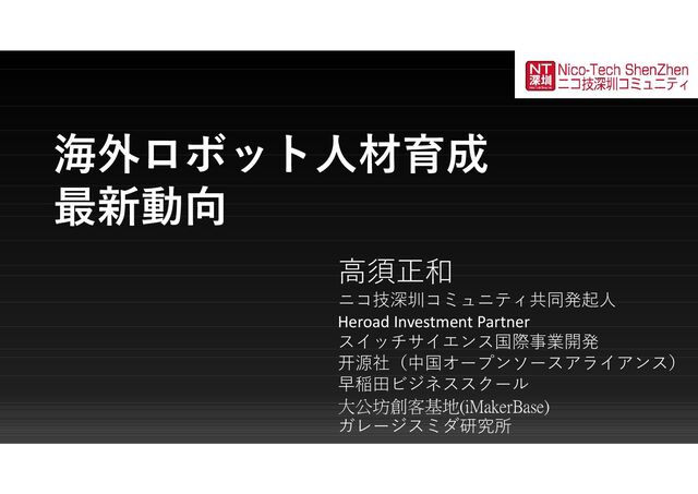 海外ロボット人材育成 最新動向 高須正和 ニコ技深圳コミュニティ共同発起人 Heroad Investment Partner スイッチサイエンス国際事業開発 开源社(中国オープンソースアライアンス) 早稲田ビジネススクール