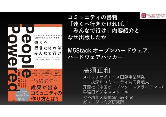 コミュニティの書籍 「遠くへ行きたければ、 みんなで行け」内容紹介と なぜ出版したか M5Stack,オープンハードウェア, ハードウェアハッカー 高須正和 スイッチサイエンス国際事業開発 ニコ技深圳コミュニティ共同発起人 开源社(中国オープンソースアライアンス)