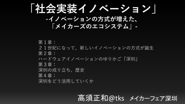 「社会実装イノベーション」 -イノベーションの方式が増えた、 「メイカーズのエコシステム」- 高須正和@tks メイカーフェア深圳 第1章: 21世紀になって、新しいイノベーションの方式が誕生 第2章: ハードウェアイノベーションのゆりかご「深圳」 第3章: