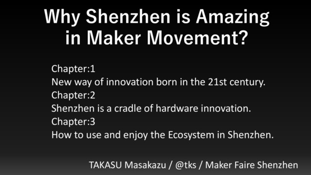 @tks / Maker Faire Shenzhen Chapter:1 New way of innovation born in the 21st century. Chapter:2 Shenzhen is a cradle of hardware innovation. Chapter:3 How to use and enjoy the Ecosystem in Shenzhen.