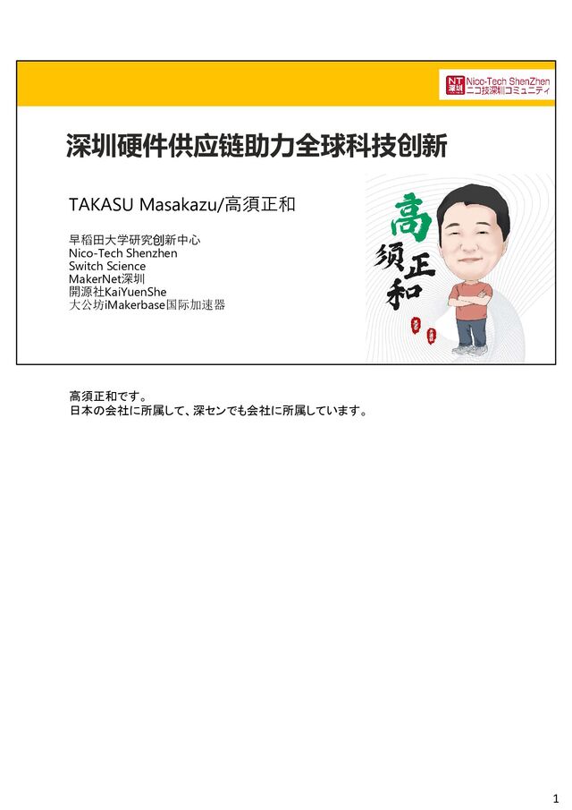 深圳硬件供应链助力全球科技创新 TAKASU Masakazu/高須正和 早稻田大学研究创新中心 Nico-Tech Shenzhen Switch Science MakerNet深圳 開源社KaiYuenShe