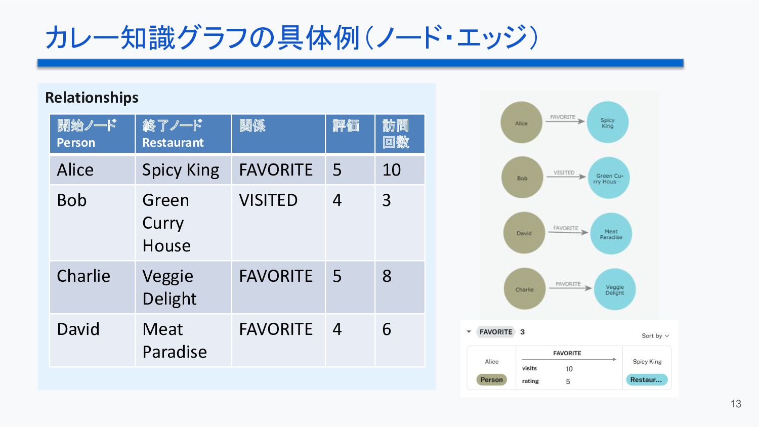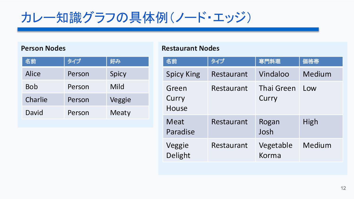 Person Mild Charlie Person Veggie David Person Meaty Restaurant Nodes 名前 タイプ 専門料理 価格帯 Spicy King Restaurant Vindaloo Medium Green Curry House Restaurant Thai Green Curry Low Meat Paradise Restaurant Rogan Josh High Veggie Delight Restaurant Vegetable Korma Medium 12