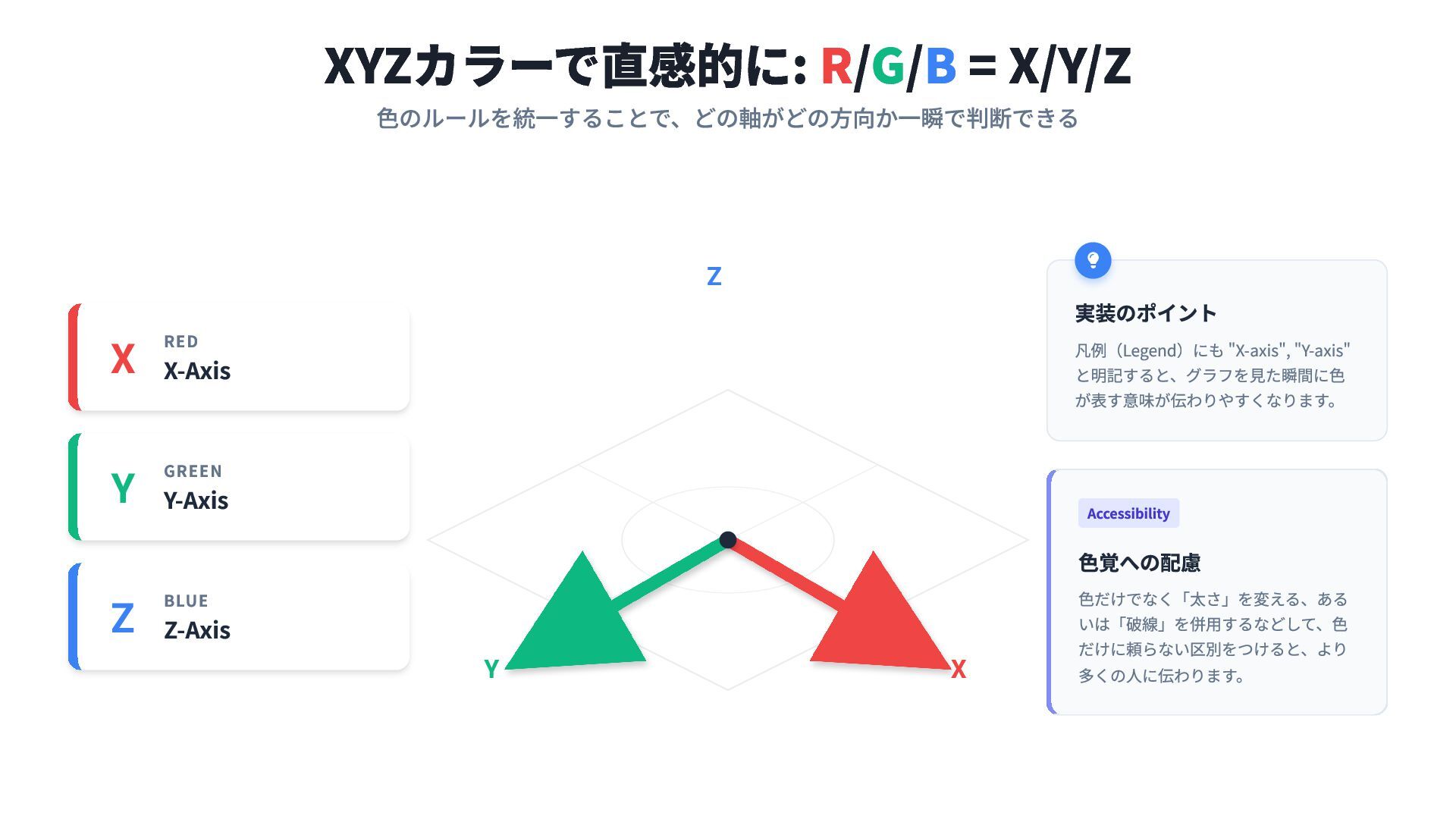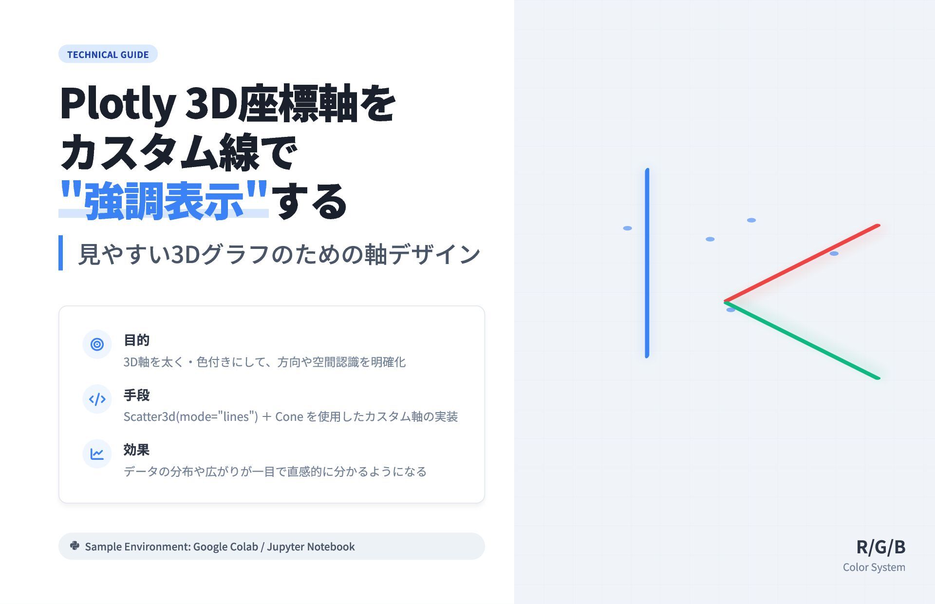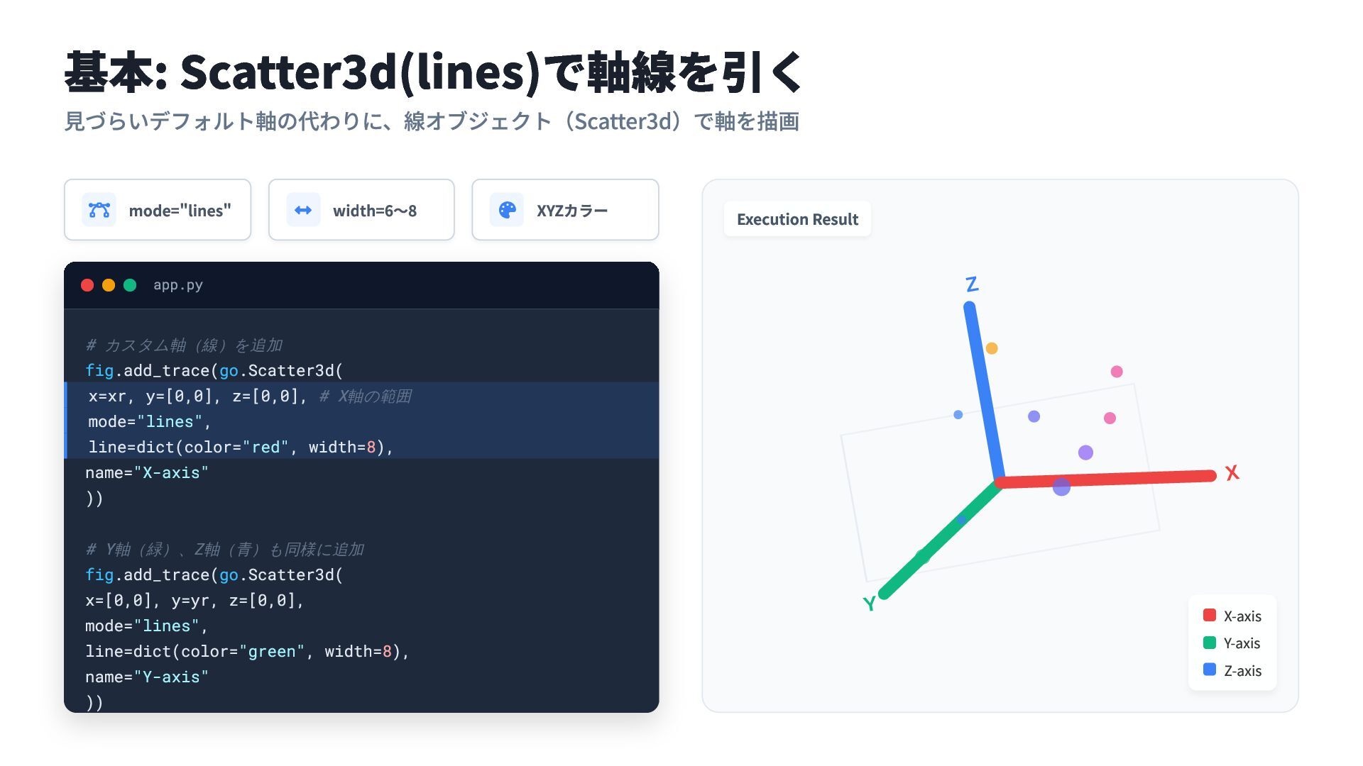 cone_arrow.py # 軸の端に矢印(Cone)を追加 fig.add_trace(go.Cone( x=[xr[1]], y=[cy], z=[cz], # X軸の終端位置 u=[1], v=[0], w=[0], # X方向ベクトル sizemode="absolute", sizeref=2, anchor="tail", # 矢印の尻尾基準 colorscale=[[0, "red"], [1, "red"]], showscale=False )) # Y軸(Green), Z軸(Blue)も同様に追加... fig.add_trace(go.Cone( x=[cx], y=[yr[1]], z=[cz], u=[0], v=[1], w=[0], X Y Z Execution Result X-axis + Cone Y-axis + Cone Z-axis + Cone