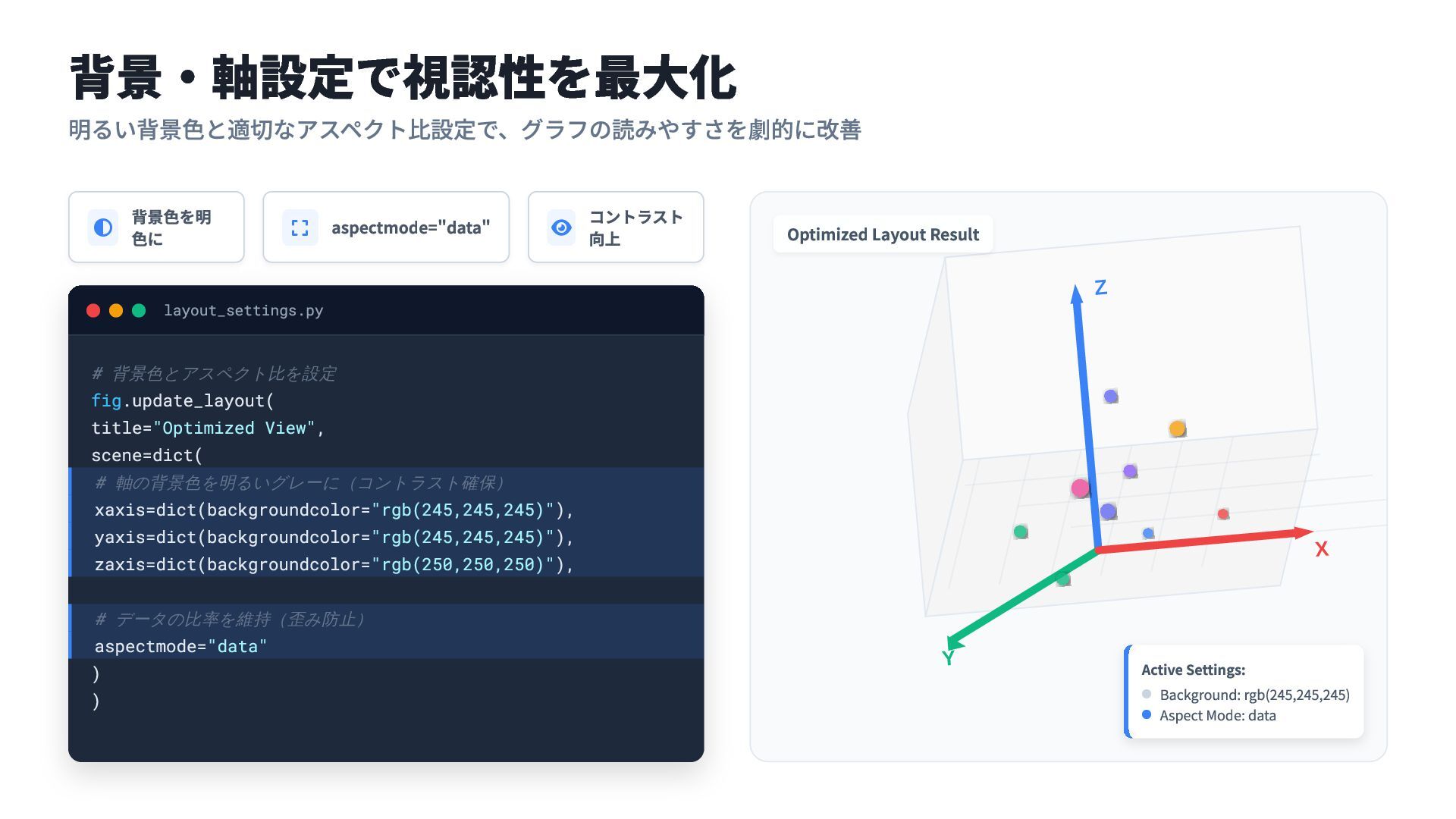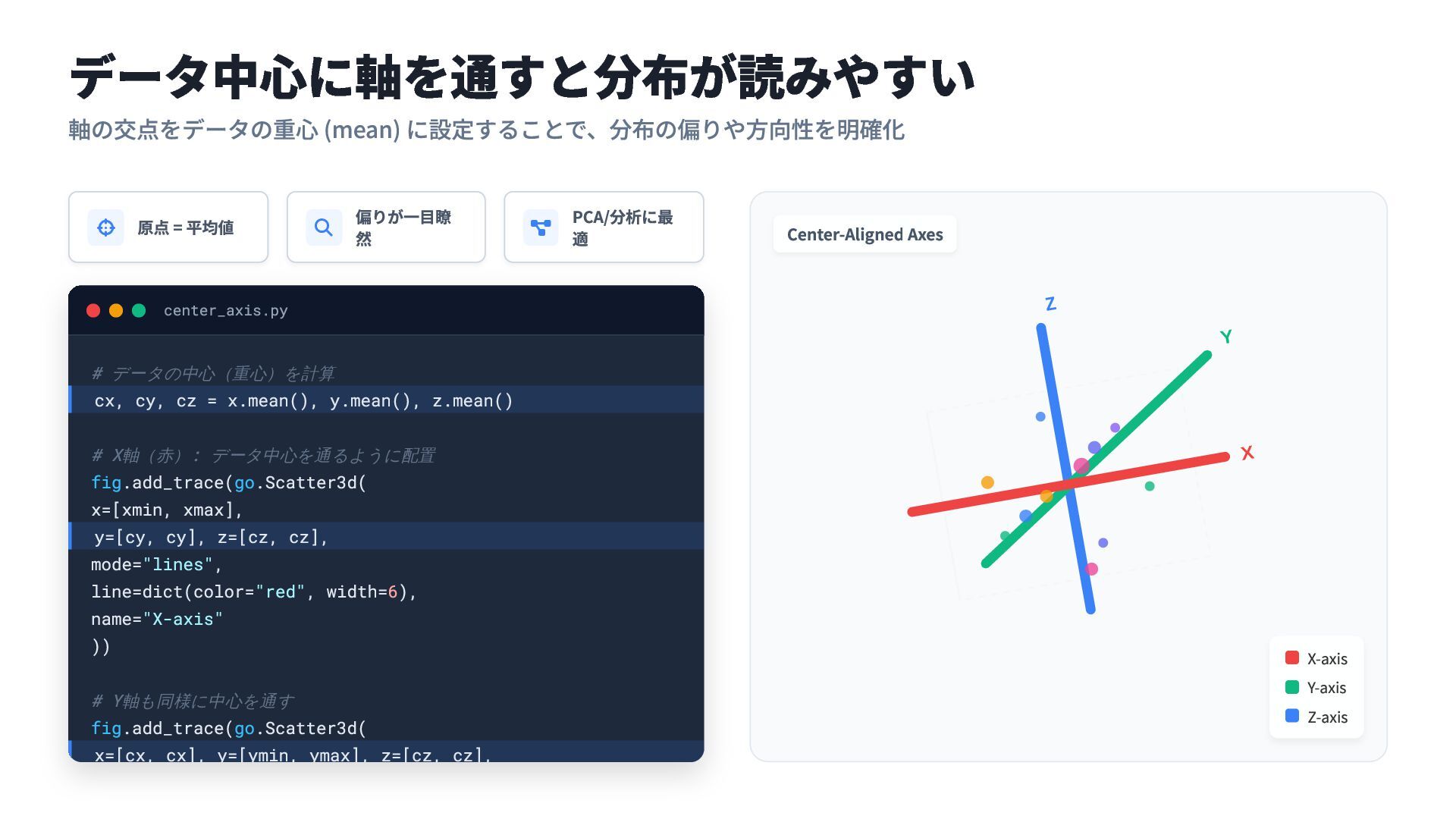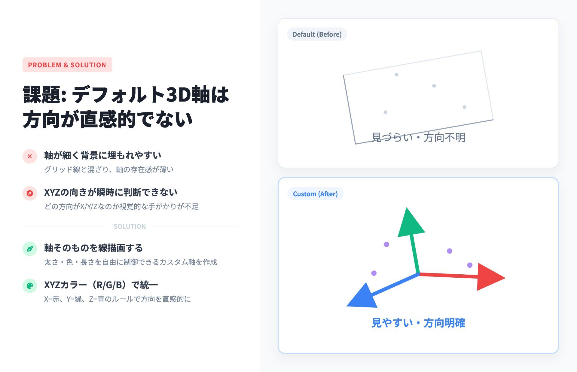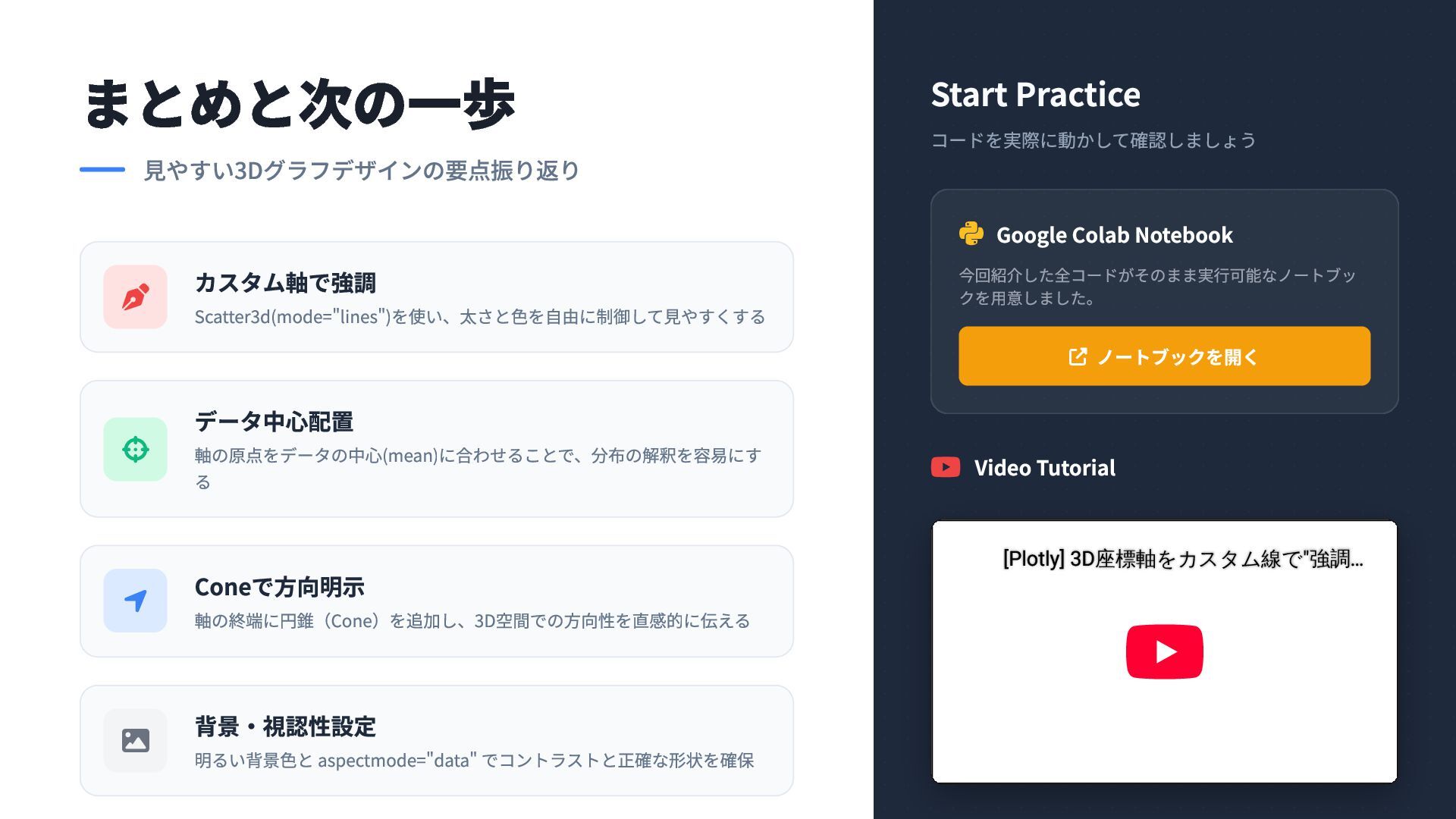 cone_arrow.py # 軸の端に矢印(Cone)を追加 fig.add_trace(go.Cone( x=[xr[1]], y=[cy], z=[cz], # X軸の終端位置 u=[1], v=[0], w=[0], # X方向ベクトル sizemode="absolute", sizeref=2, anchor="tail", # 矢印の尻尾基準 colorscale=[[0, "red"], [1, "red"]], showscale=False )) # Y軸(Green), Z軸(Blue)も同様に追加... fig.add_trace(go.Cone( x=[cx], y=[yr[1]], z=[cz], u=[0], v=[1], w=[0], X Y Z Execution Result X-axis + Cone Y-axis + Cone Z-axis + Cone