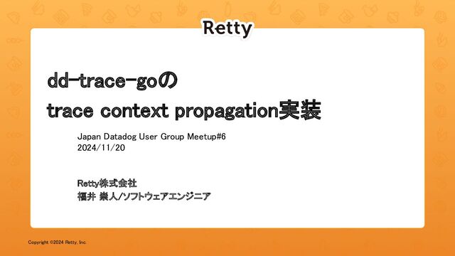 Inc. Copyright ©2024 Retty, Inc. dd-trace-goの trace context propagation実装 Japan Datadog User Group Meetup#6 2024/11/20 Retty株式会社 福井 崇人/ソフトウェアエンジニア
