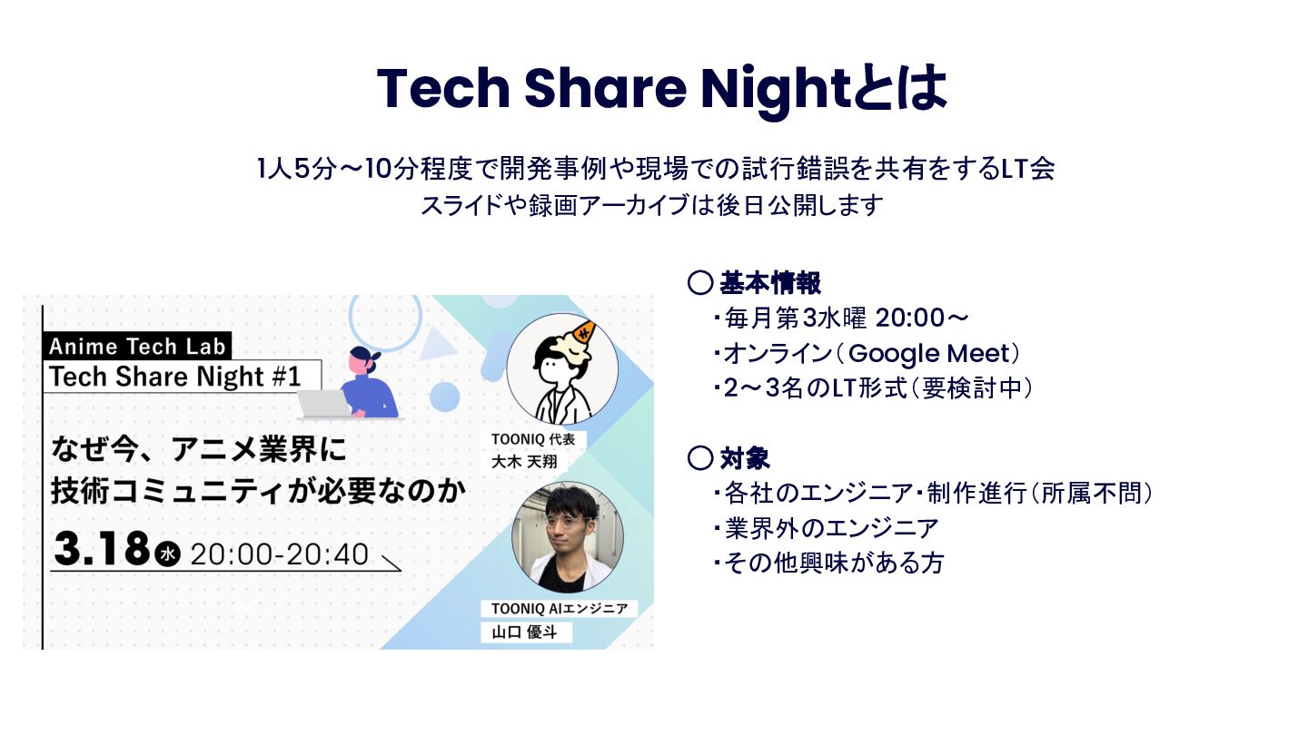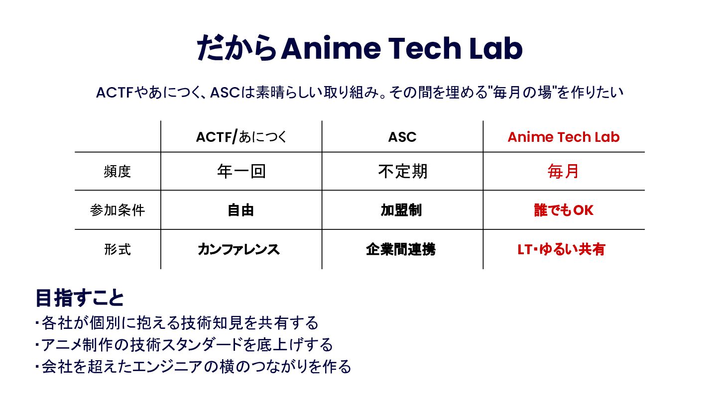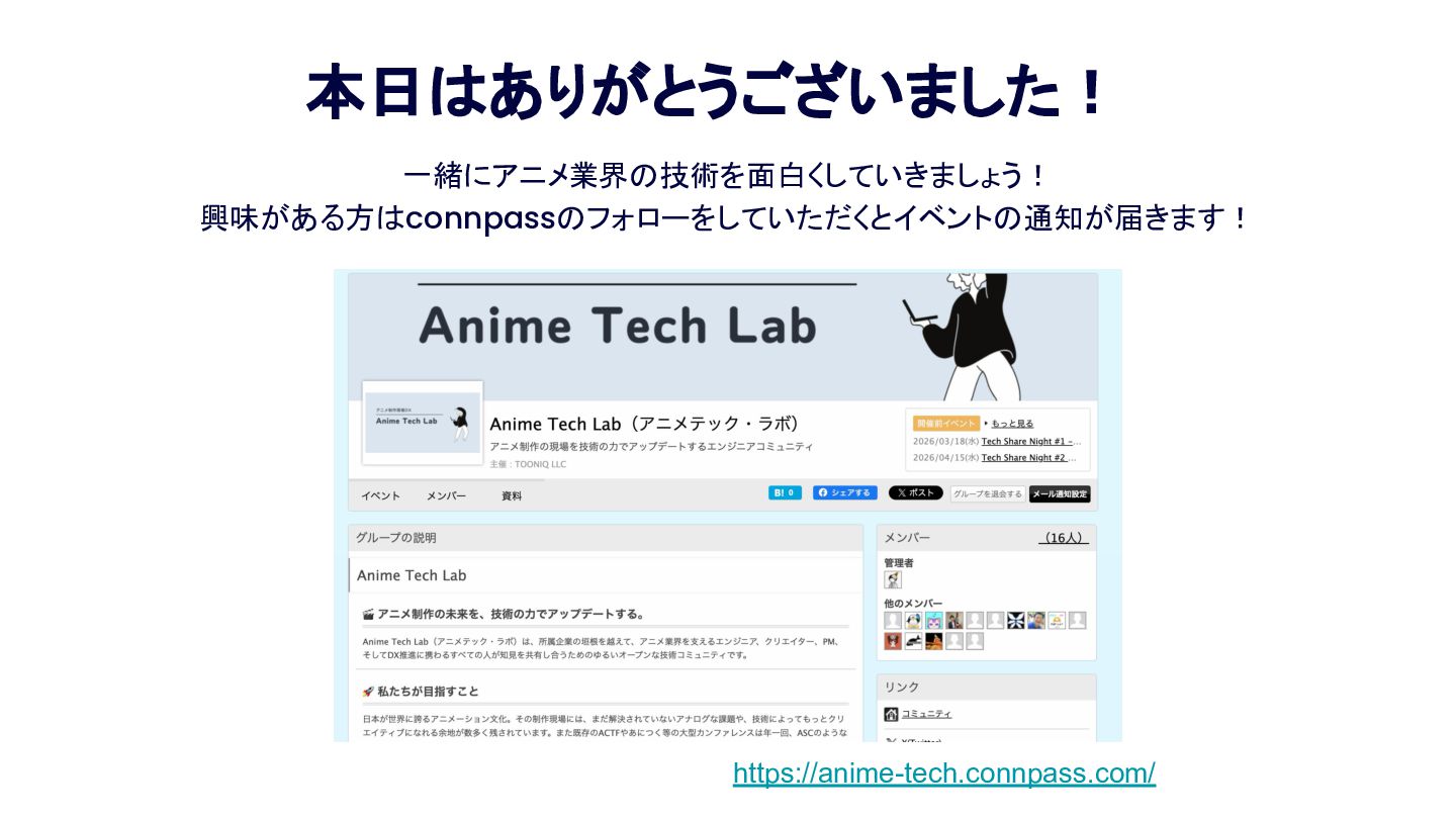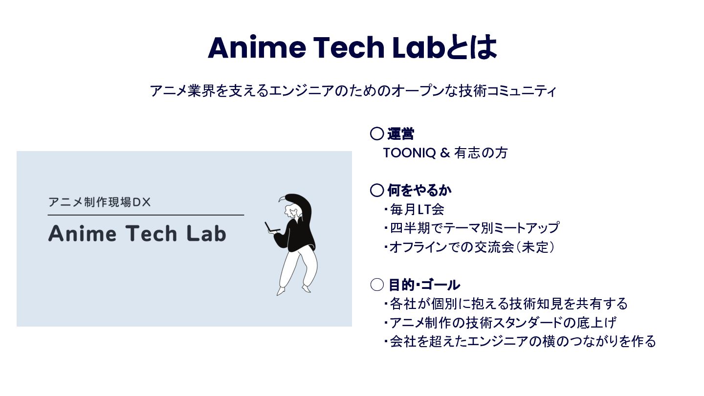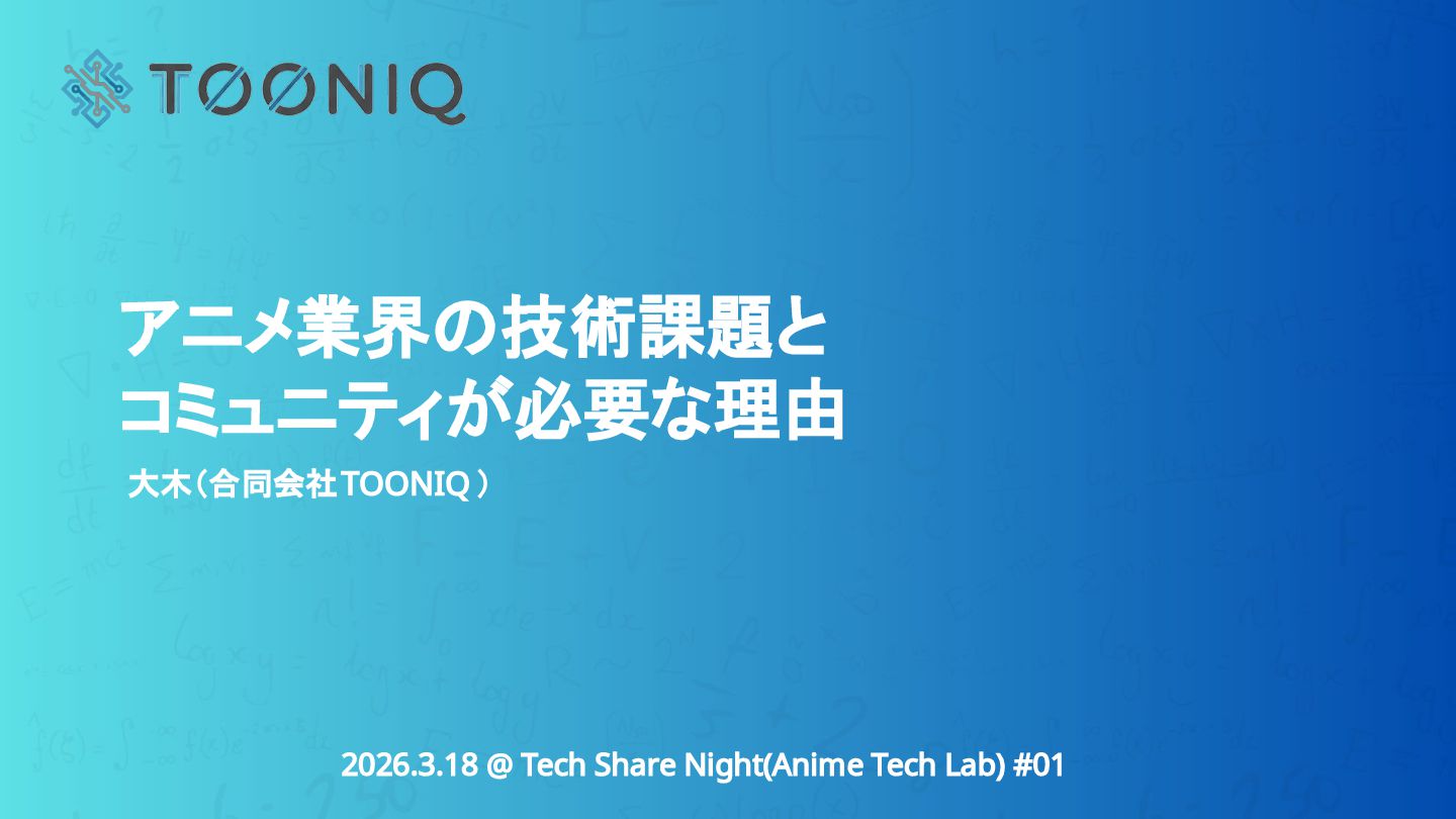 Anime Tech Lab 第1回「Tech Share Night」の登壇資料です。アニメ制作現場の技術課題と、オープンな技術コミュニティの必要性について。 #AnimeTechLab