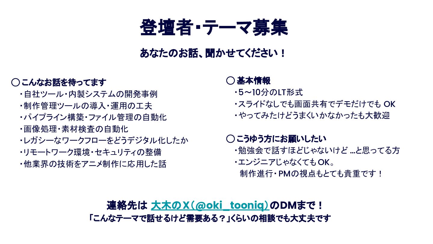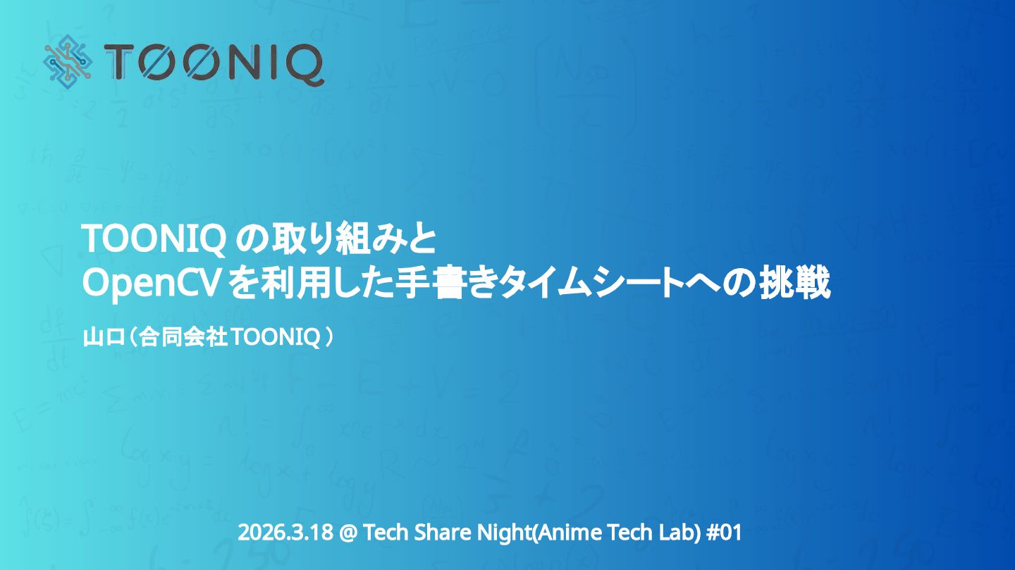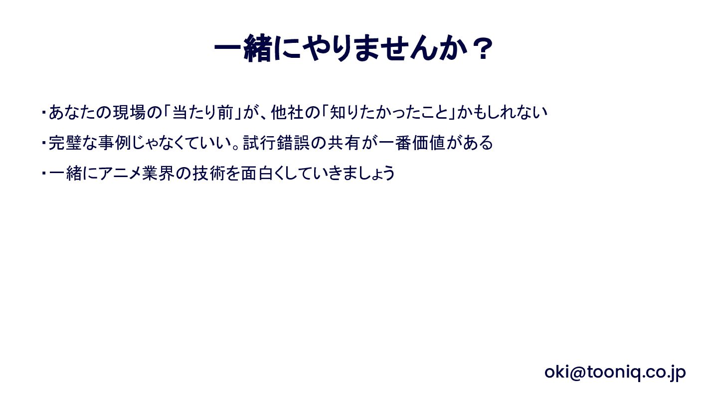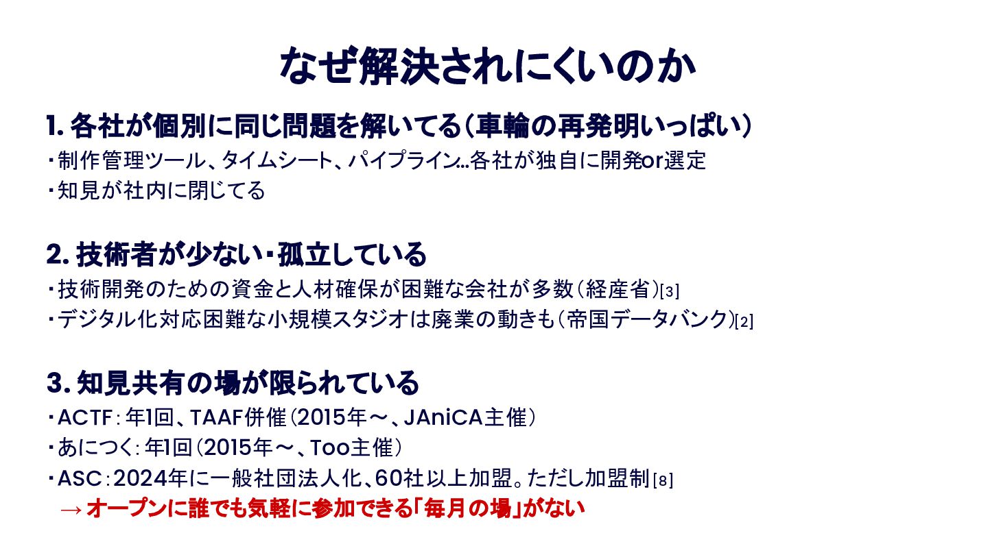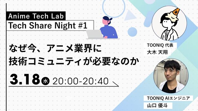 Anime Tech Lab 第1回「Tech Share Night」の登壇資料です。アニメ制作現場の技術課題と、オープンな技術コミュニティの必要性について。 #AnimeTechLab
