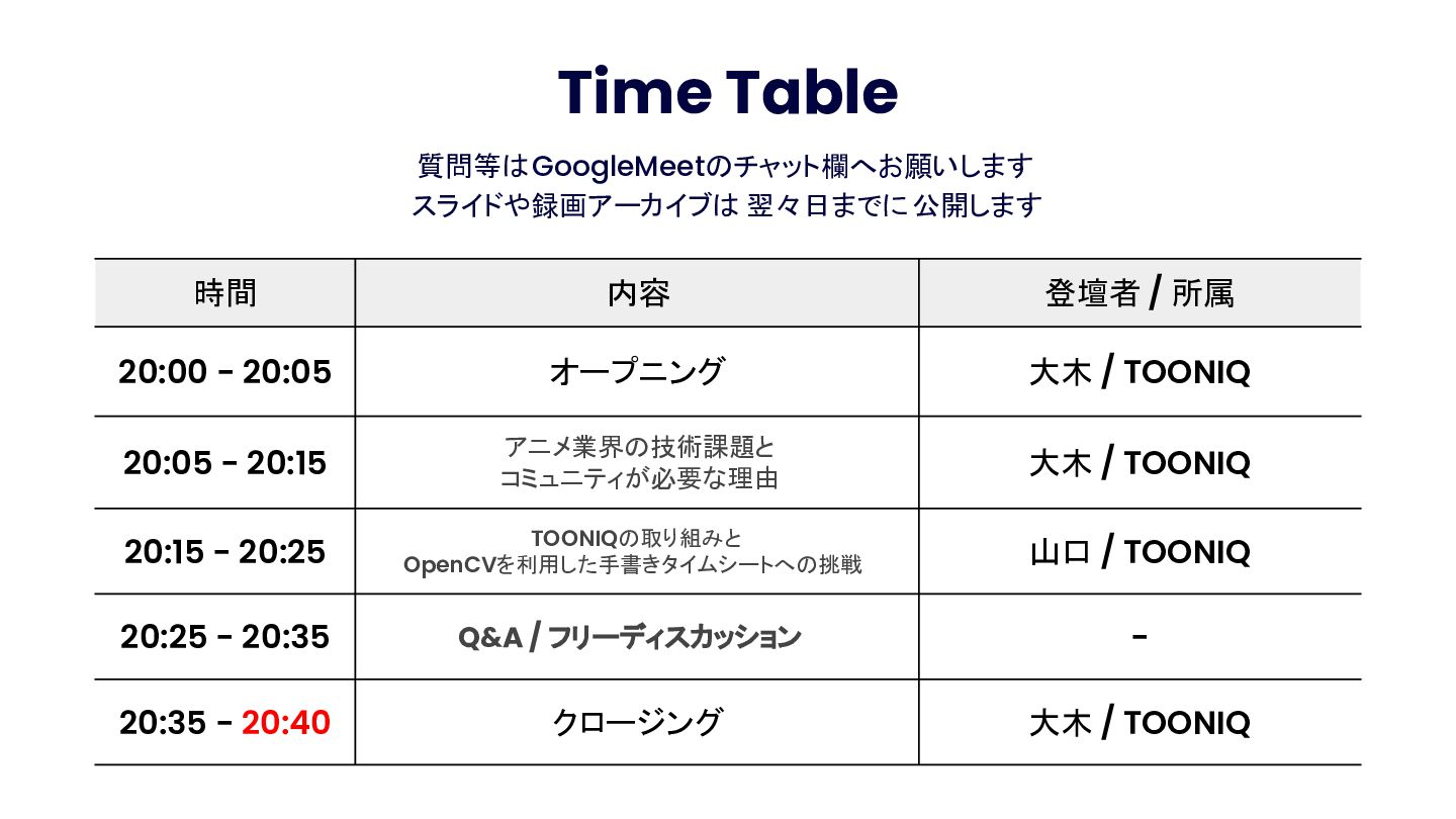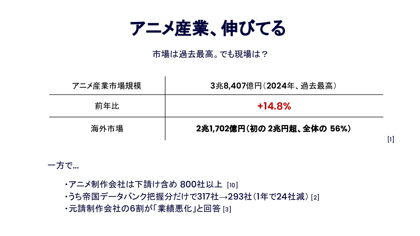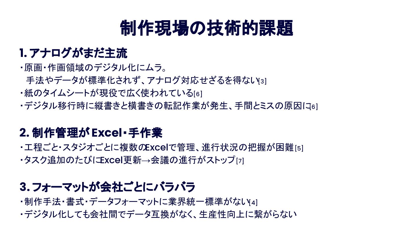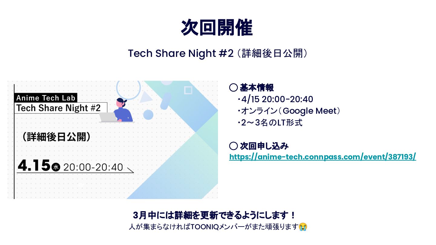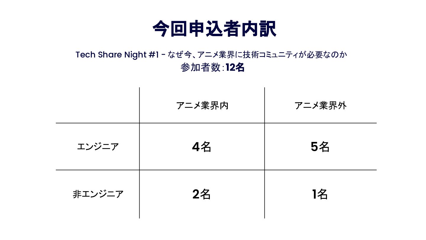 Anime Tech Lab 第1回「Tech Share Night」の登壇資料です。アニメ制作現場の技術課題と、オープンな技術コミュニティの必要性について。 #AnimeTechLab
