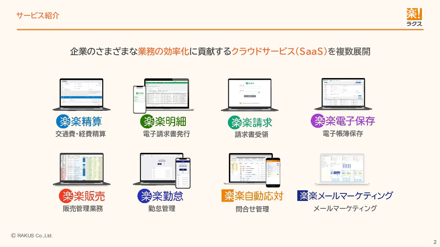 2. Ⓒ RAKUS Co.,Ltd. 勤怠管理 サービス紹介 2 交通費・経費精算 電子請求書発行 販売管理業務 メールマーケティング