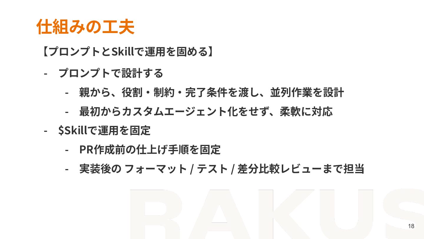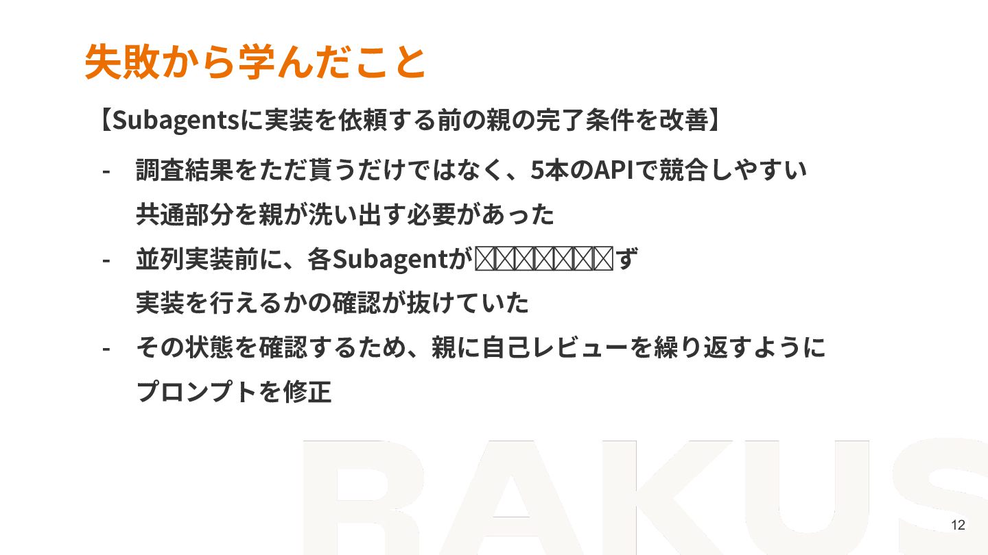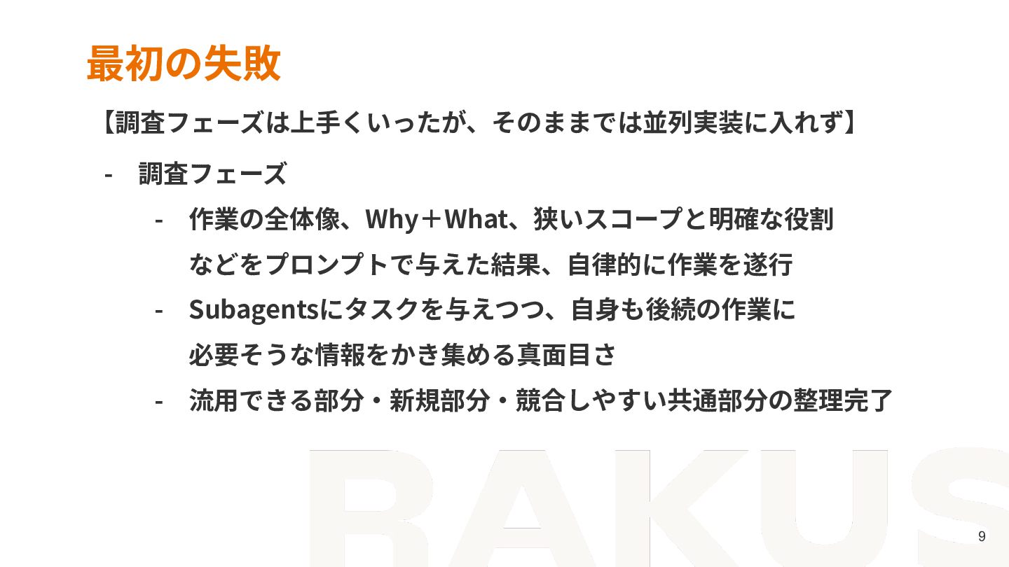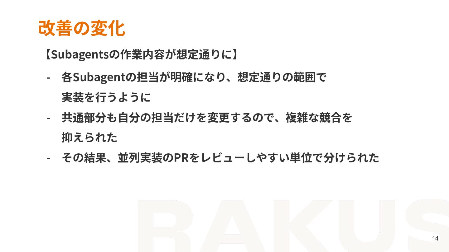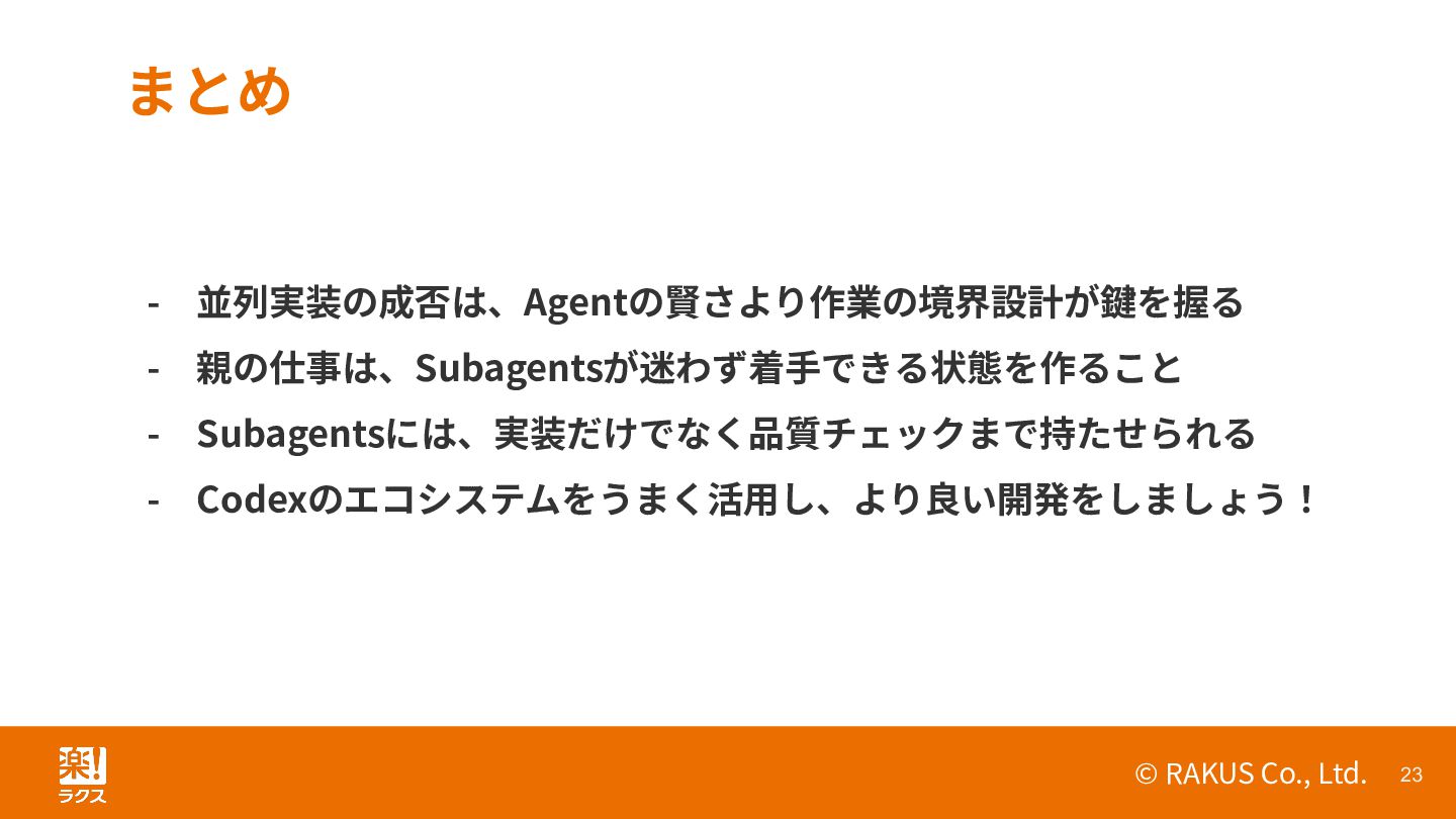 8. © RAKUS Co., Ltd. 23 まとめ - 並列実装の成否は、Agentの賢さより作業の境界設計が鍵を握る - 親の仕事は、Subagentsが迷わず着⼿できる状態を作ること