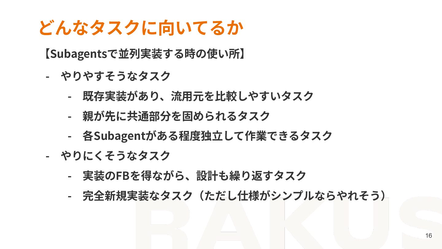 - やりにくそうなタスク - 実装のFBを得ながら、設計も繰り返すタスク - 完全新規実装なタスク(ただし仕様がシンプルならやれそう) 【Subagentsで並列実装する時の使い所】