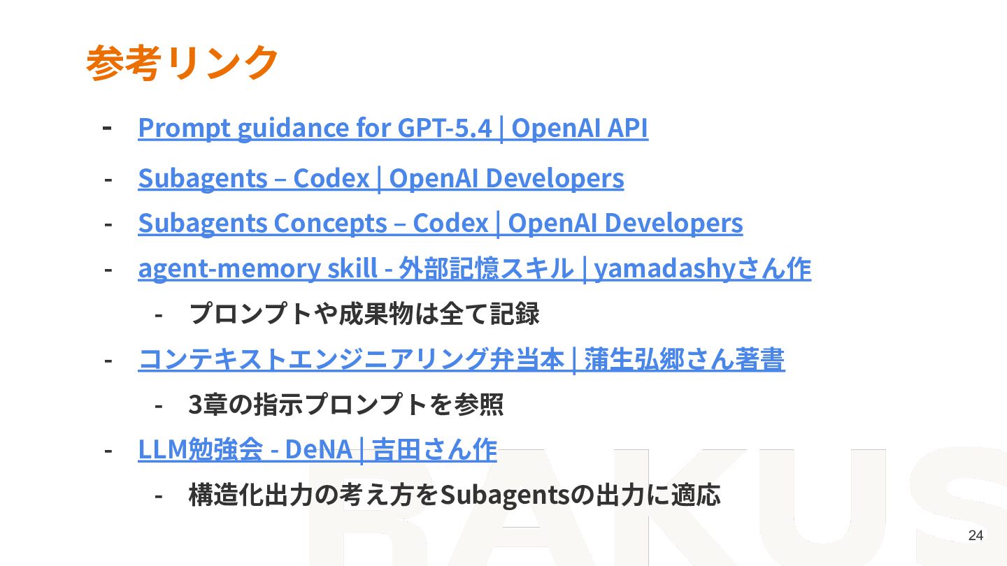 - Subagents ‒ Codex | OpenAI Developers - Subagents Concepts ‒ Codex | OpenAI Developers - agent-memory skill - 外部記憶スキル | yamadashyさん作 - プロンプトや成果物は全て記録 - コンテキストエンジニアリング弁当本 | 蒲⽣弘郷さん著書 - 3章の指⽰プロンプトを参照 - LLM勉強会 - DeNA | 吉⽥さん作 - 構造化出⼒の考え⽅をSubagentsの出⼒に適応