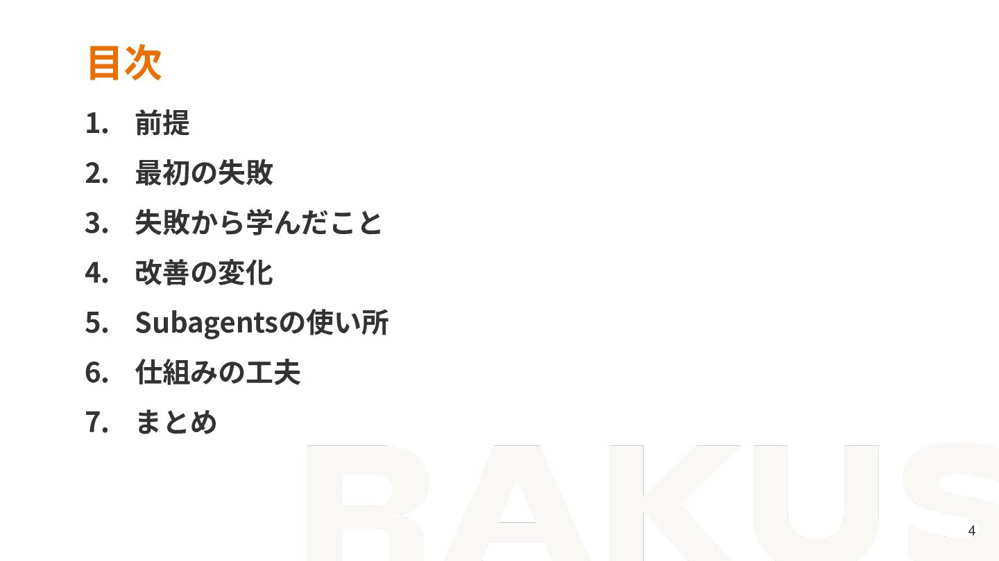 5. Subagentsの使い所 6. 仕組みの⼯夫 7. まとめ
