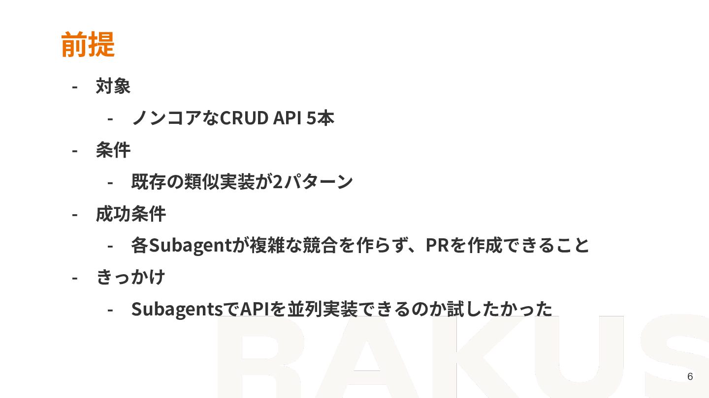 - 既存の類似実装が2パターン - 成功条件 - 各Subagentが複雑な競合を作らず、PRを作成できること - きっかけ - SubagentsでAPIを並列実装できるのか試したかった