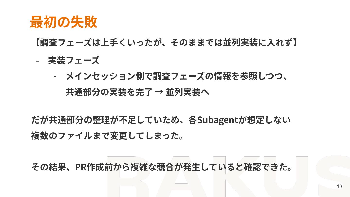 6. 10 最初の失敗 【調査フェーズは上⼿くいったが、そのままでは並列実装に⼊れず】 - 実装フェーズ - メインセッション側で調査フェーズの情報を参照しつつ、 共通部分の実装を完了 → 並列実装へ