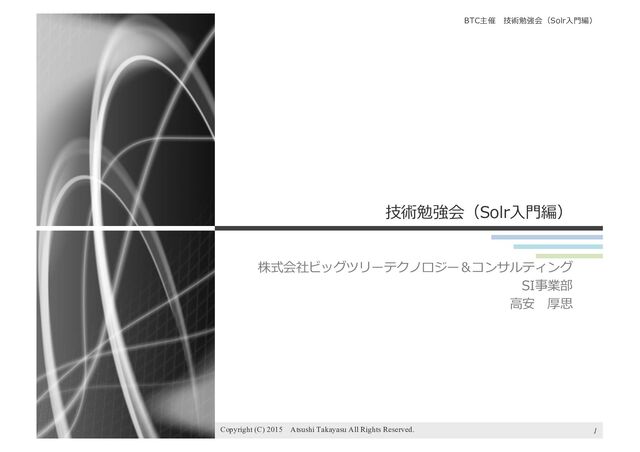 35 Copyright (C) 2015 Atsushi Takayasu All Rights Reserved. SolrServer server = new HttpSolrServer("http://localhost:8983/solr/wiki/"); private static List<SolrInputDocument> list = new ArrayList<>(); SolrInputDocument input = new SolrInputDocument(); input.setField("title", model.getTitle()); input.setField("description", model.getHtml()); for (String category : model.getCategories()) { input.addField("category", category); } list.add(input); if (list.size() > COMMIT_COUNT) { server.add(list); server.commit(); list.clear(); } コミットには⼀定コストがかかるので、 まとめて実施するのがセオリー