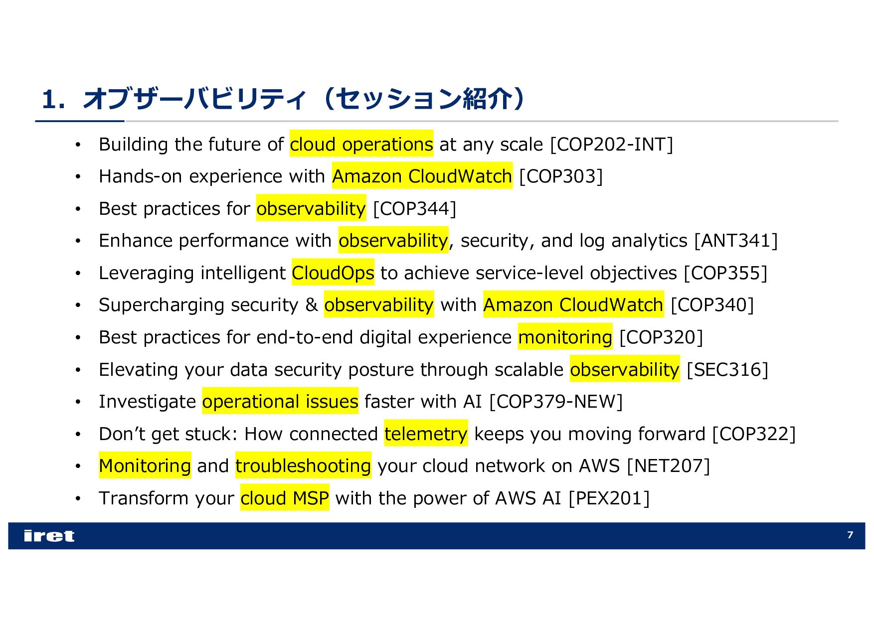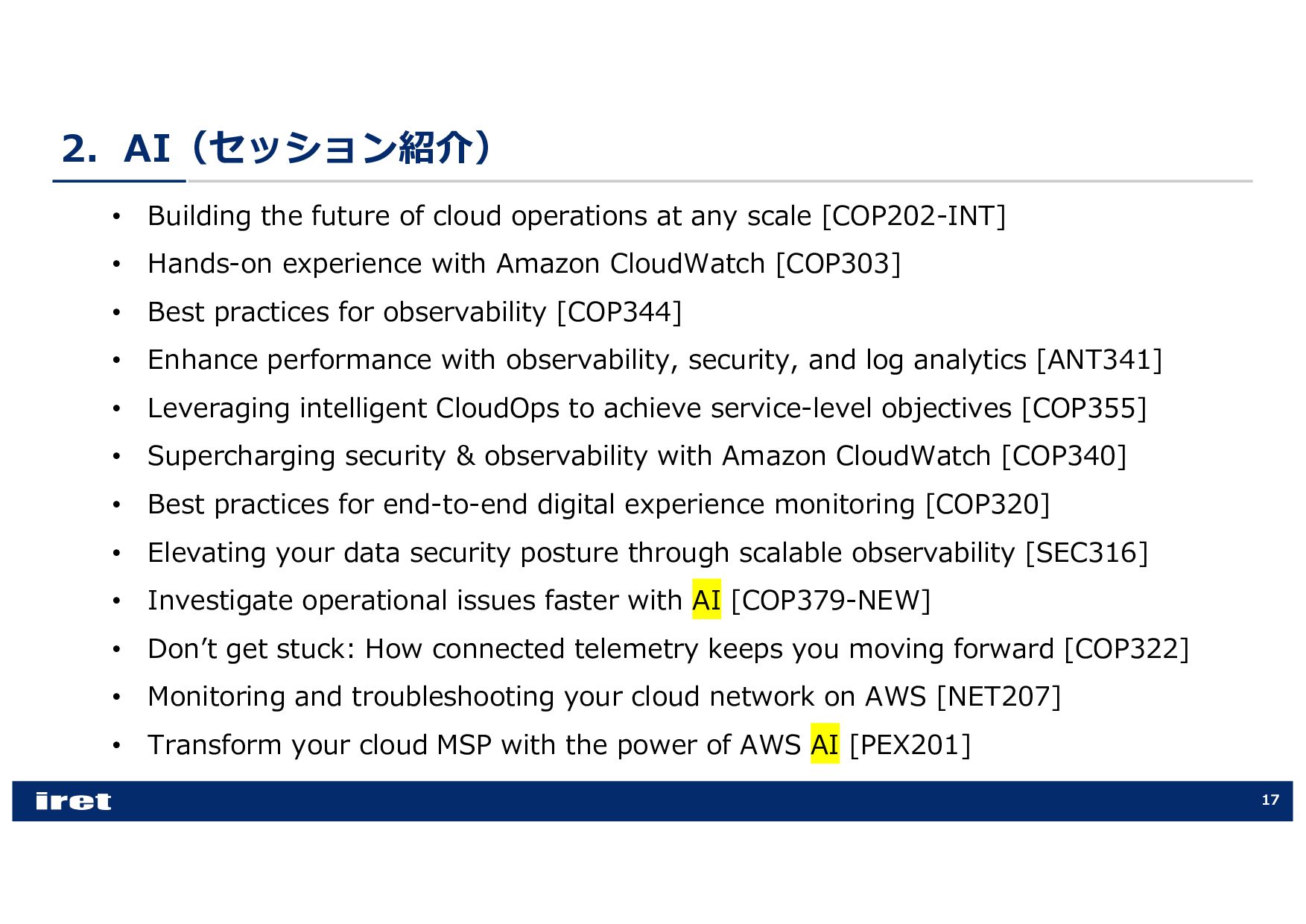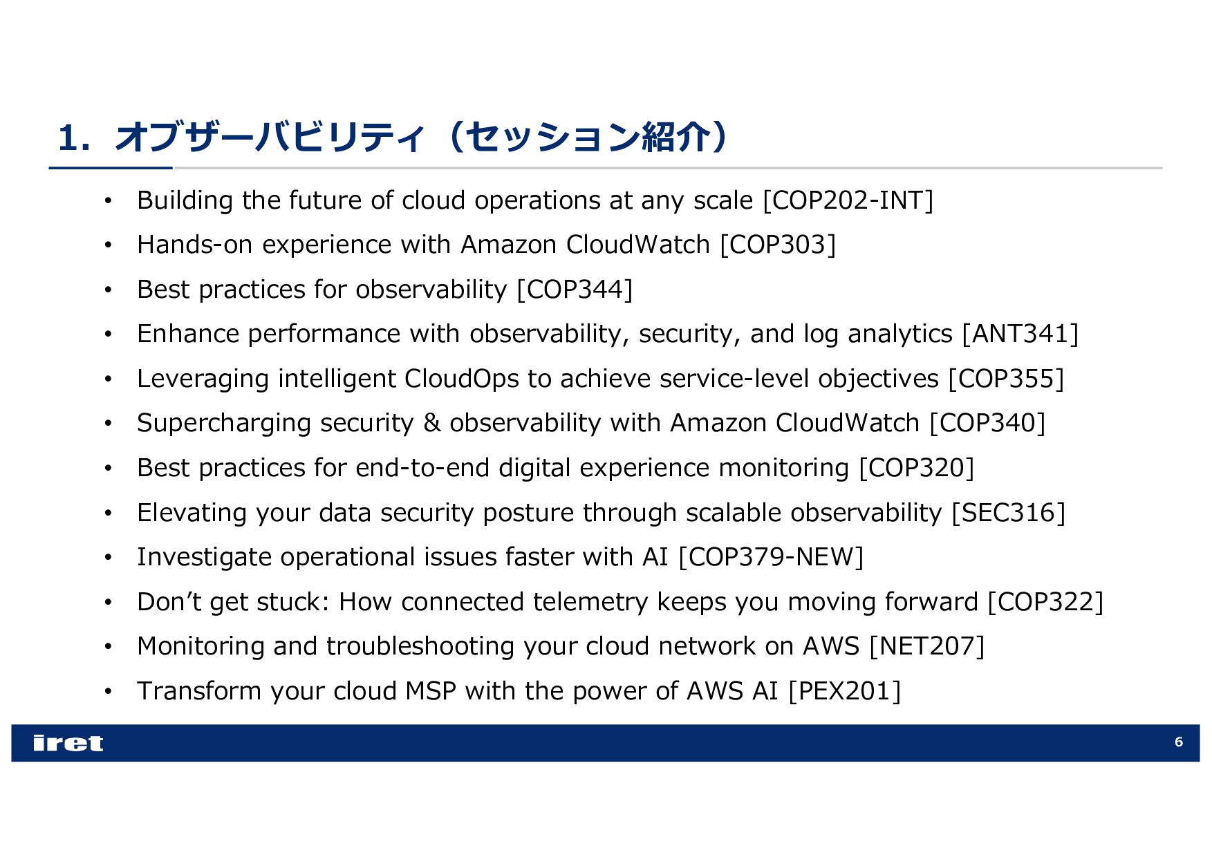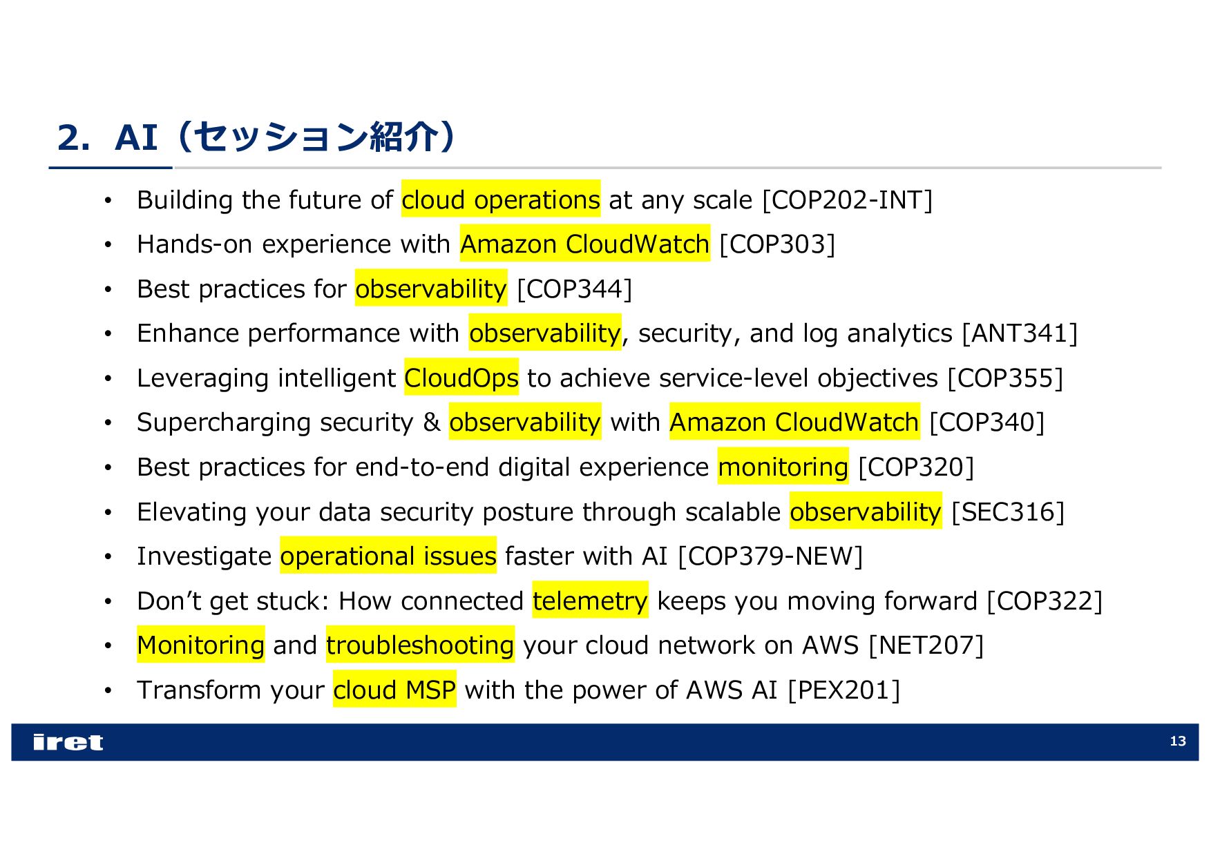 any scale [COP202-INT] • Hands-on experience with Amazon CloudWatch [COP303] • Best practices for observability [COP344] • Enhance performance with observability, security, and log analytics [ANT341] • Leveraging intelligent CloudOps to achieve service-level objectives [COP355] • Supercharging security & observability with Amazon CloudWatch [COP340] • Best practices for end-to-end digital experience monitoring [COP320] • Elevating your data security posture through scalable observability [SEC316] • Investigate operational issues faster with AI [COP379-NEW] • Donʼt get stuck: How connected telemetry keeps you moving forward [COP322] • Monitoring and troubleshooting your cloud network on AWS [NET207] • Transform your cloud MSP with the power of AWS AI [PEX201]