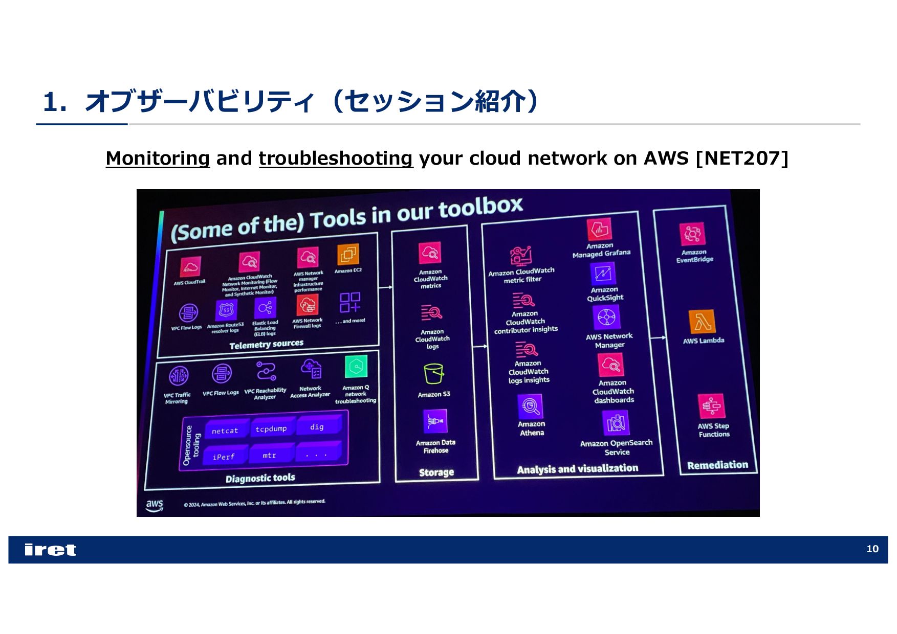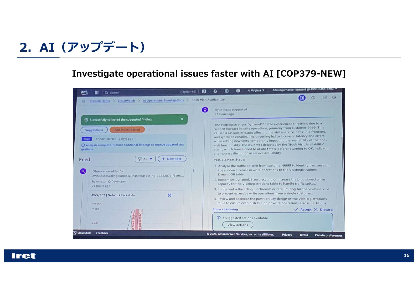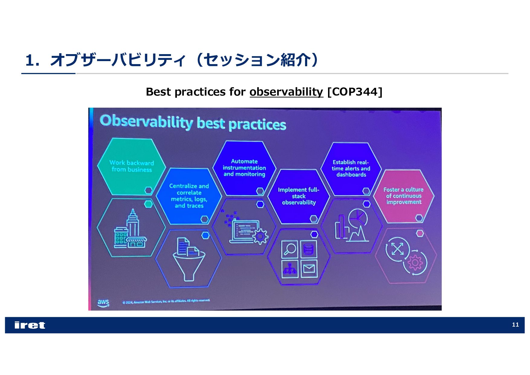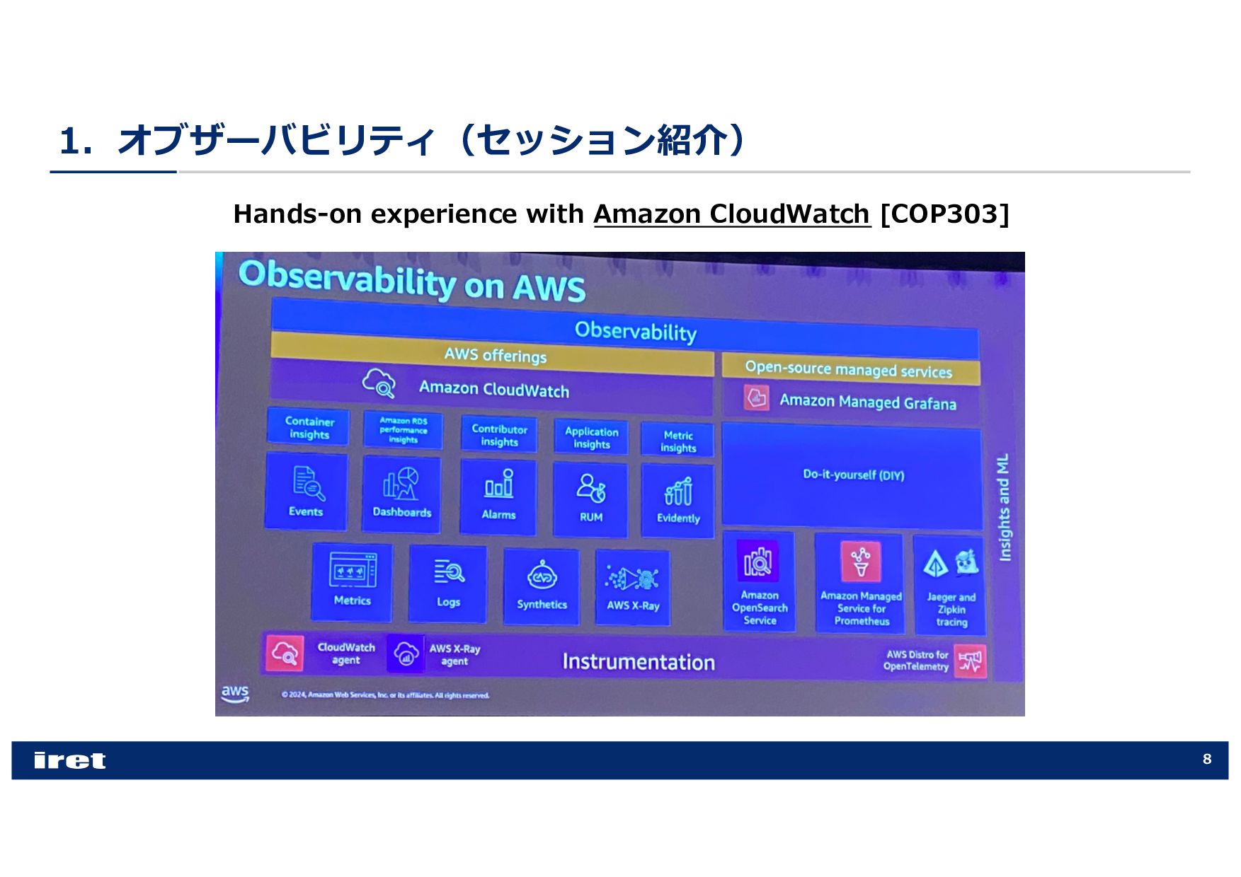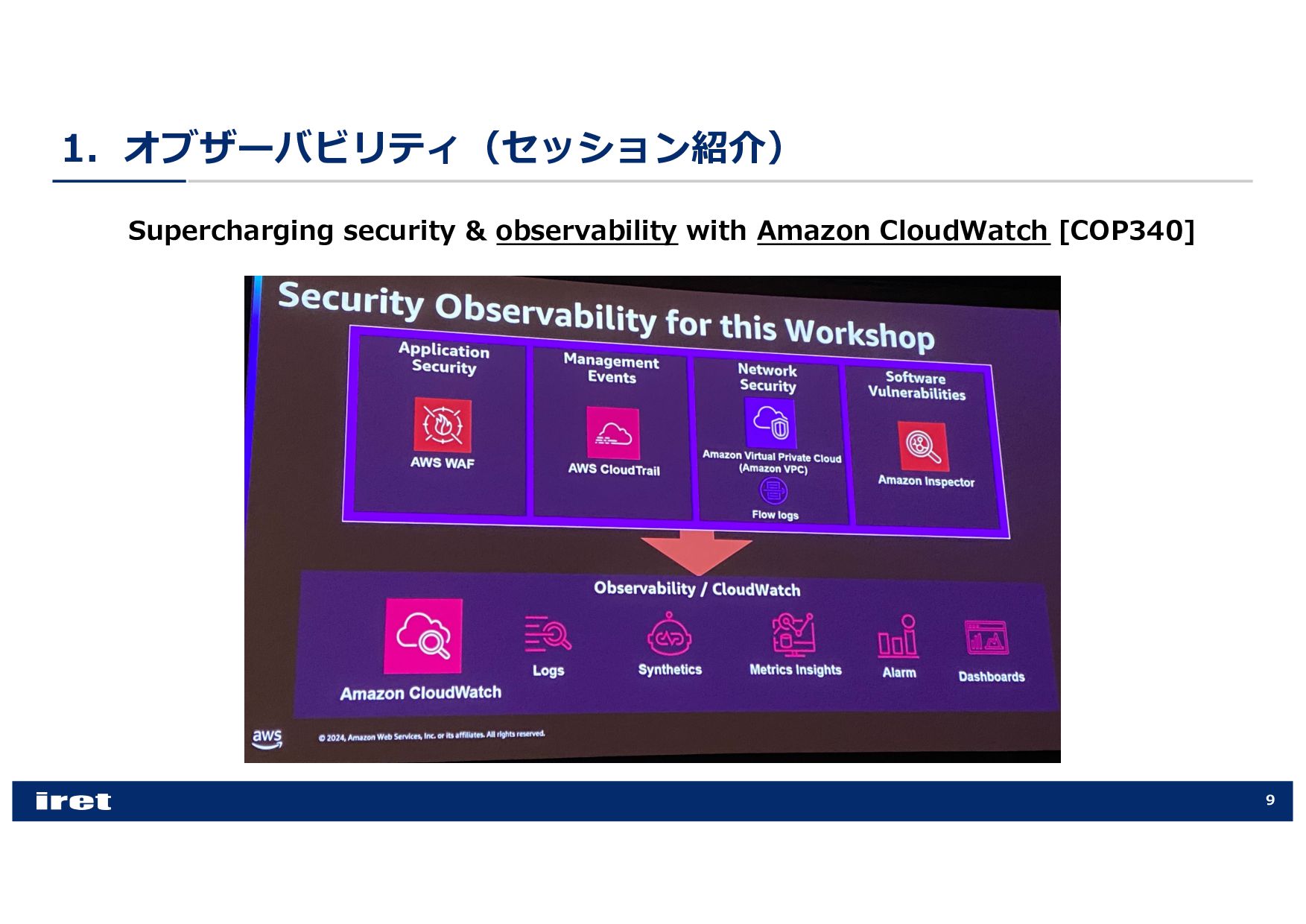 any scale [COP202-INT] • Hands-on experience with Amazon CloudWatch [COP303] • Best practices for observability [COP344] • Enhance performance with observability, security, and log analytics [ANT341] • Leveraging intelligent CloudOps to achieve service-level objectives [COP355] • Supercharging security & observability with Amazon CloudWatch [COP340] • Best practices for end-to-end digital experience monitoring [COP320] • Elevating your data security posture through scalable observability [SEC316] • Investigate operational issues faster with AI [COP379-NEW] • Donʼt get stuck: How connected telemetry keeps you moving forward [COP322] • Monitoring and troubleshooting your cloud network on AWS [NET207] • Transform your cloud MSP with the power of AWS AI [PEX201]