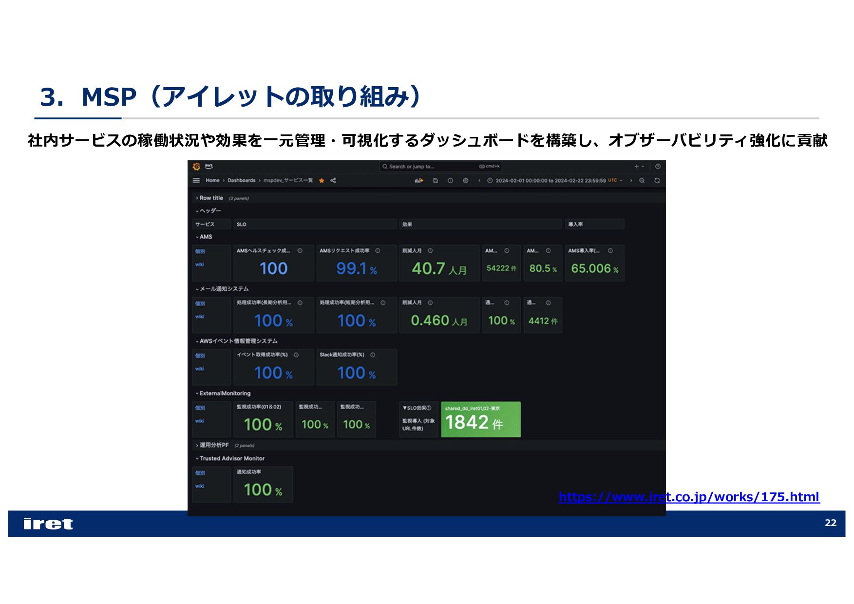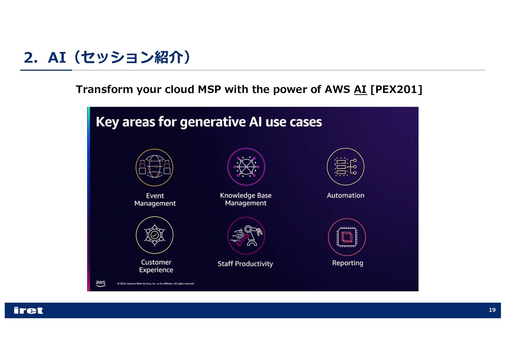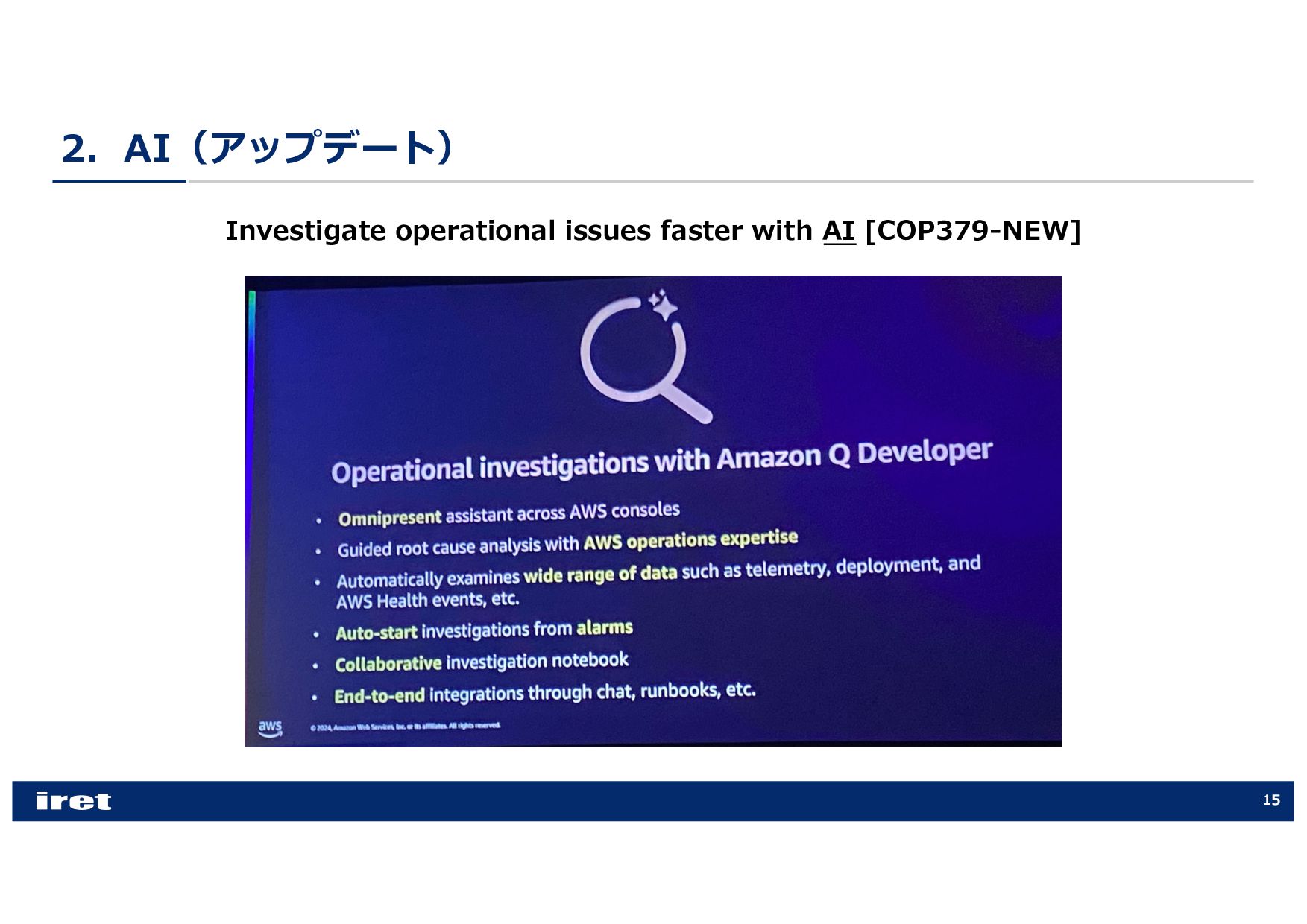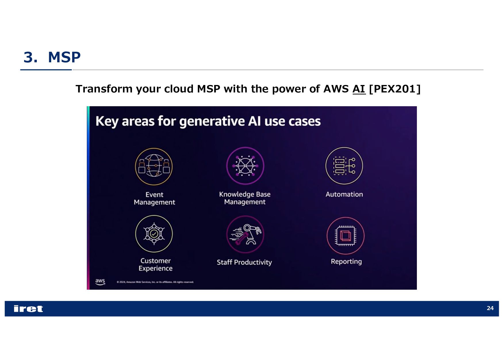 any scale [COP202-INT] • Hands-on experience with Amazon CloudWatch [COP303] • Best practices for observability [COP344] • Enhance performance with observability, security, and log analytics [ANT341] • Leveraging intelligent CloudOps to achieve service-level objectives [COP355] • Supercharging security & observability with Amazon CloudWatch [COP340] • Best practices for end-to-end digital experience monitoring [COP320] • Elevating your data security posture through scalable observability [SEC316] • Investigate operational issues faster with AI [COP379-NEW] • Donʼt get stuck: How connected telemetry keeps you moving forward [COP322] • Monitoring and troubleshooting your cloud network on AWS [NET207] • Transform your cloud MSP with the power of AWS AI [PEX201]