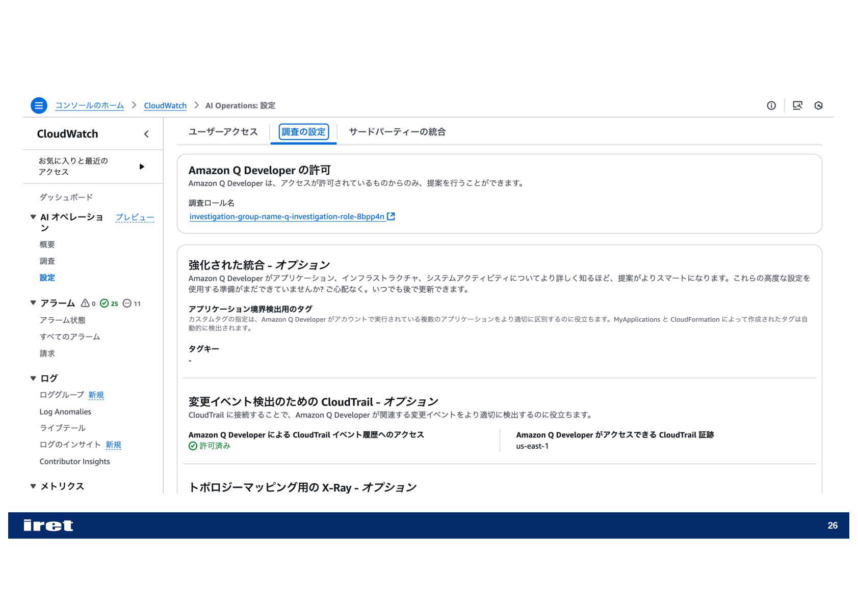 ⼈がするのは ・内容精査 ・判断 ・修正作業 ここまで AI がやってくれる ・分析 ・原因予測 ・修正サポート 情報収集 ・CloudWatch テレメトリ ・AWS CloudTrail ログ ・デプロイ情報 ・AWS Health イベント